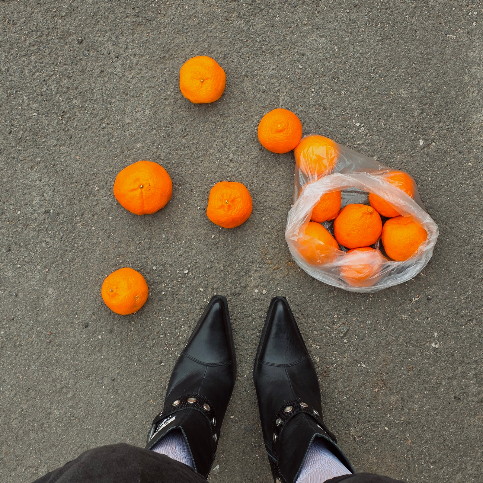 A top-down shot shows a bag of oranges on the ground next to a pair of feet. The oranges are bright orange and are both inside and outside of the plastic bag. The bag sits on an asphalt surface. A pai…read more