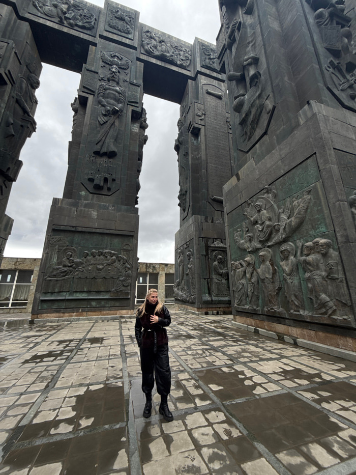 A blonde female stands in the foreground, centered slightly left, amidst the massive bronze columns of the Chronicle of Georgia monument, located on a hilltop overlooking the Tbilisi Sea in Tbilisi, G…read more