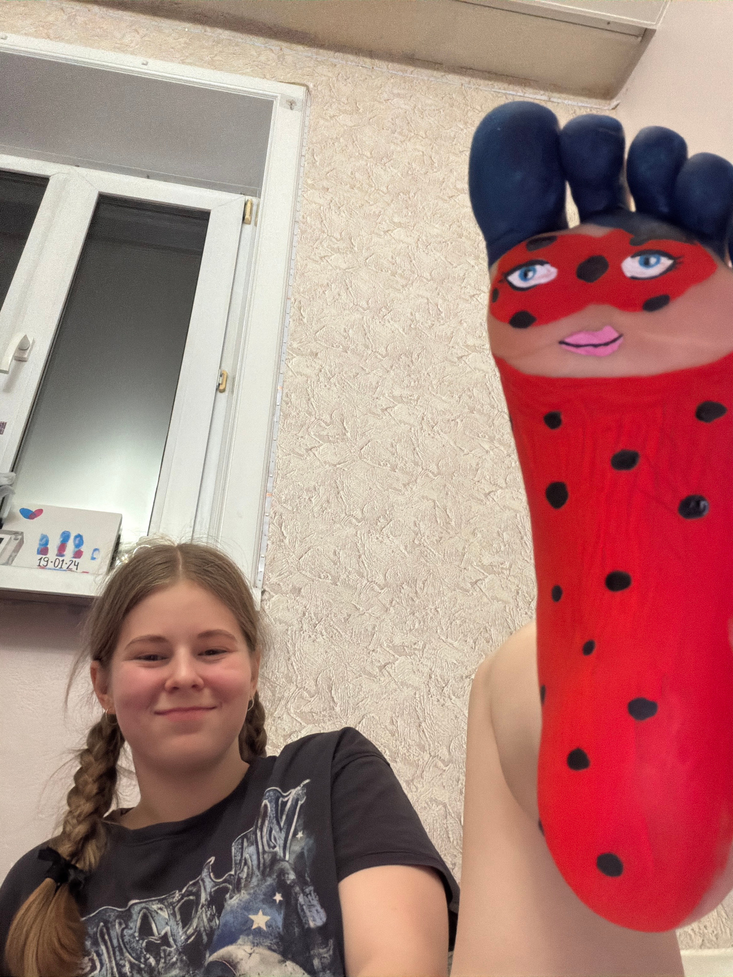 A fair-skinned young woman with blonde hair in braids is holding up her painted foot. The foot is painted to resemble the character Ladybug from Miraculous: Tales of Ladybug & Cat Noir. The toes are pā¦read more