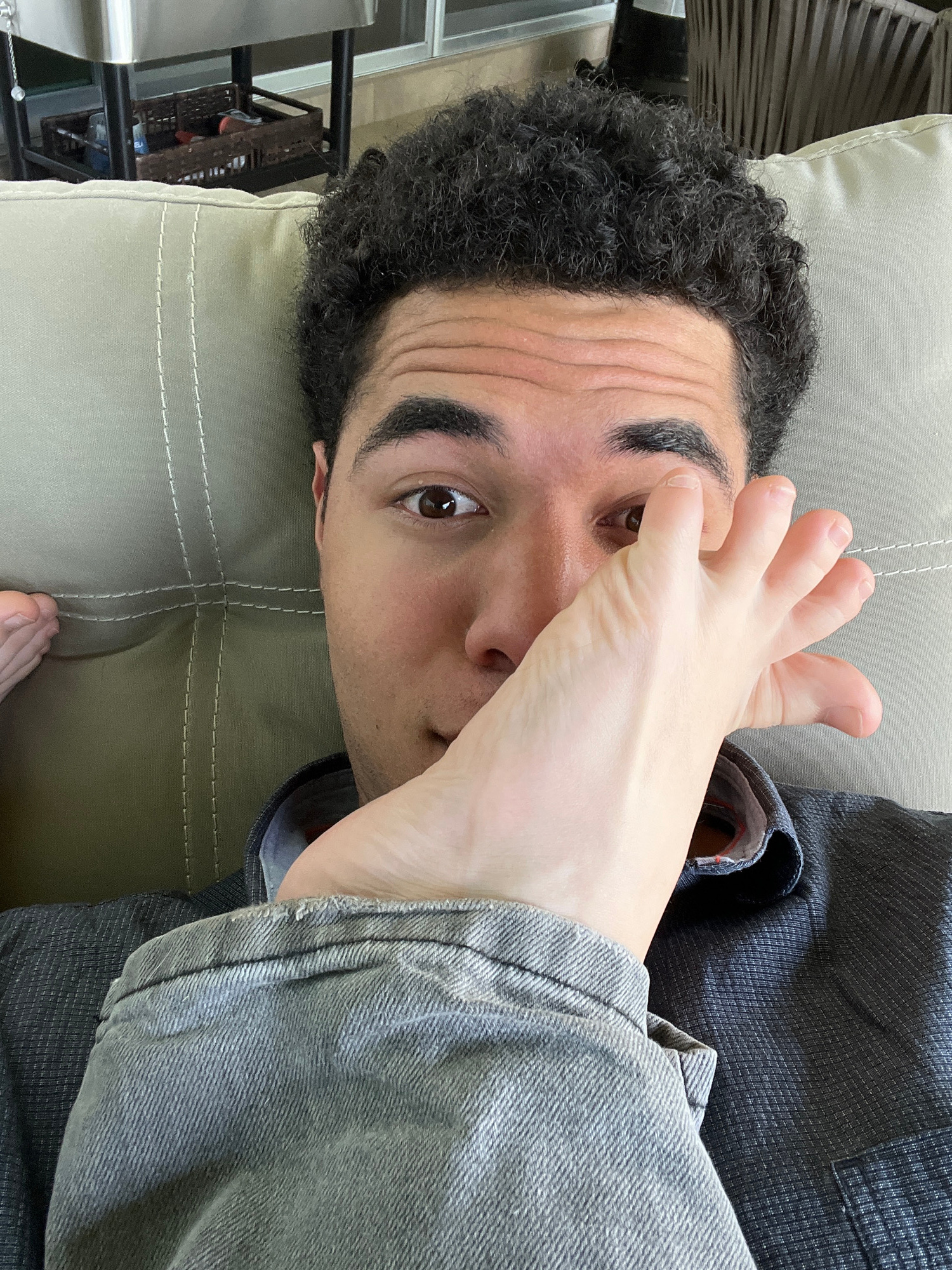 A person with dark curly hair is lying on a beige cushion, with a right foot covering part of the face. The person's face is turned to the side, with one eye visible. The person is wearing a gray deni…read more