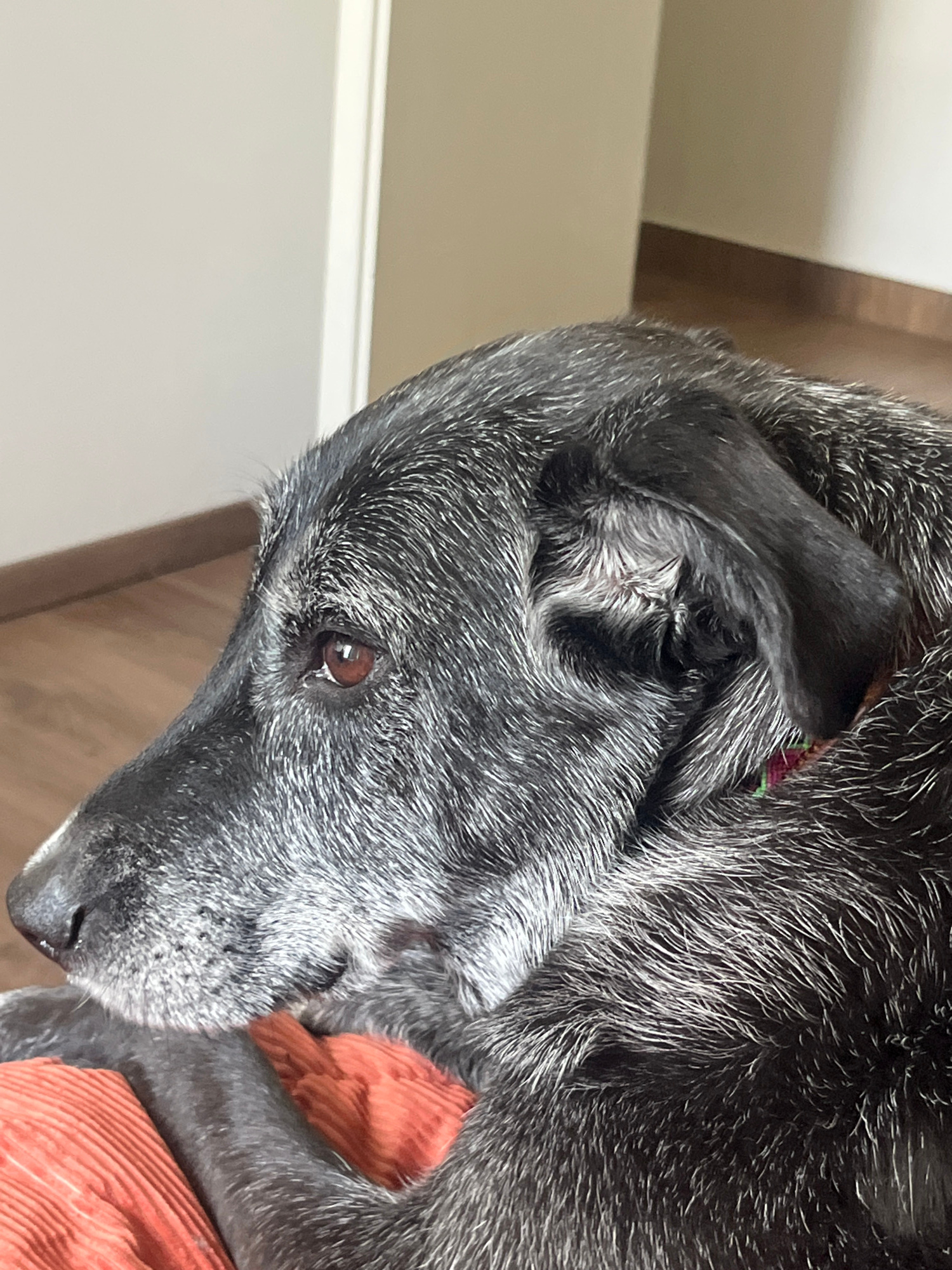A close-up shot of a dog's head. The dog has short, gray and black fur. The dog's eye is visible and brown. Part of an orange textured object appears behind the dog's head, to the right. In the backgr…read more