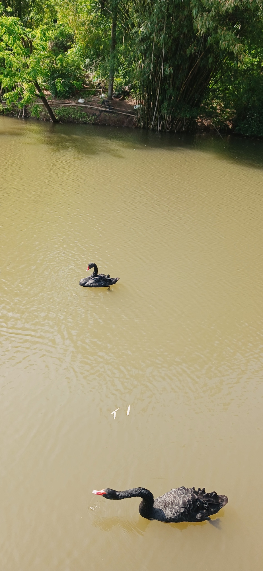 An aerial or high-angle shot captures a tranquil scene of two black swans swimming in a body of murky, greenish-yellow water. The water dominates the frame, while a verdant bank of dense vegetation runs along the left side. This bank is heavily forested with tall, slender, bamboo-like plants and other lush green trees, suggesting a natural or cultivated park-like environment. Two black swans are the main subjects in the water. One swan, positioned closer to the viewer and towards the right, is gracefully gliding with its long, curved neck dipping forward. Its head, featuring a prominent red-tipped beak, is partially submerged in the water, indicating it is either drinking or foraging. Gentle ripples spread outwards from its head. The other black swan is further back and to the left, also swimming across the water, though less distinctly visible than the foreground swan. The water's surface has subtle ripples and reflects a soft, even light, suggesting it is daytime with diffused lighting, possibly under an overcast sky or during the early morning/late afternoon. Several small, light-colored objects, likely leaves or petals, are seen floating near the closer swan. The overall ambiance of the image is one of calmness and natural beauty. The setting is located in the Chongqing High-tech Zone, China. There is no visible text in the media. | Open Wire