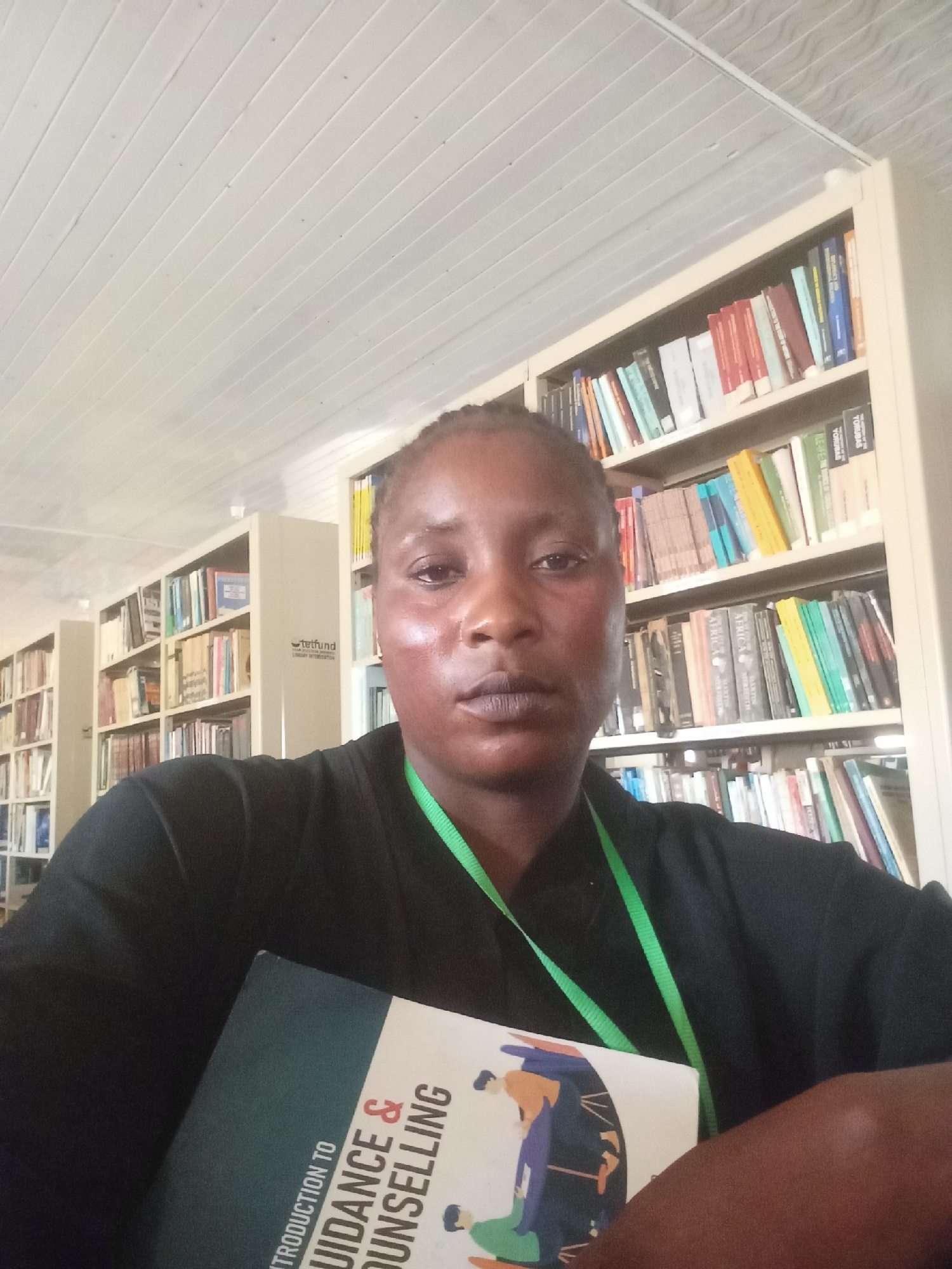 The image shows a person holding a book titled "Introduction to Guidance & Counselling" in what appears to be a library in Akwanga, Nigeria. The person is wearing a black top and a green lanyard. Shel…read more