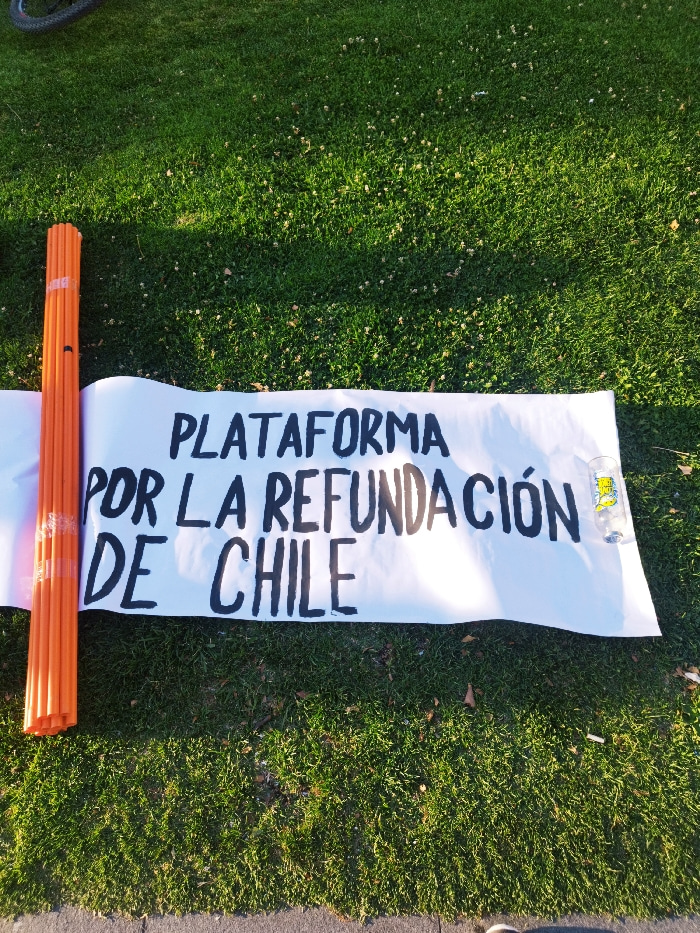 On a grassy surface, a white banner reads "PLATAFORMA POR LA REFUNDACIÓN DE CHILE" in bold, black letters. To the left, a bundle of orange poles is wrapped with clear tape. A plastic bottle sits on th…read more