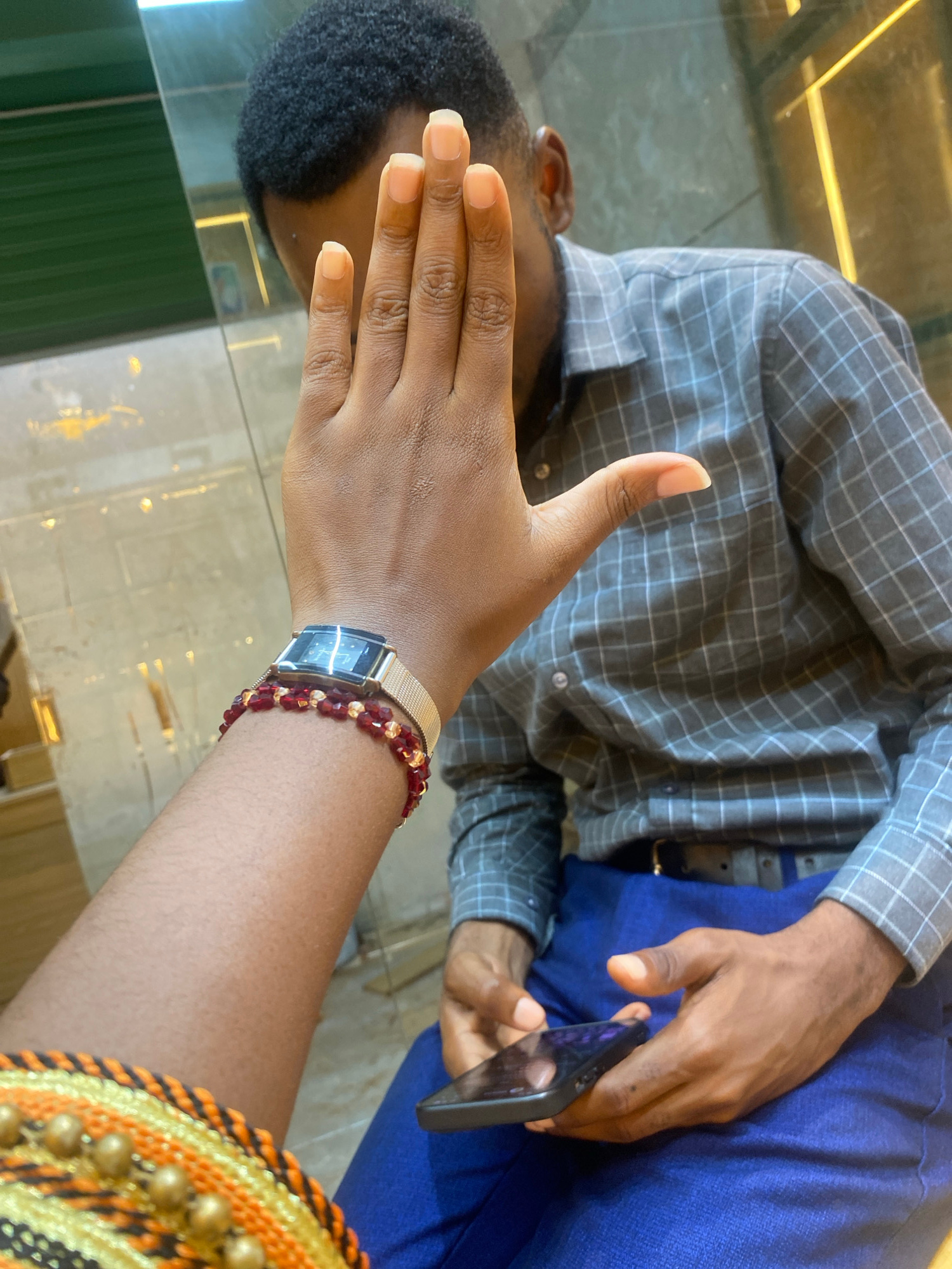 The image shows a person wearing a grey checkered long-sleeved shirt, blue pants, a watch with a silver band, and a beaded bracelet, seated at a reflective surface, possibly a glass table. The person'…read more