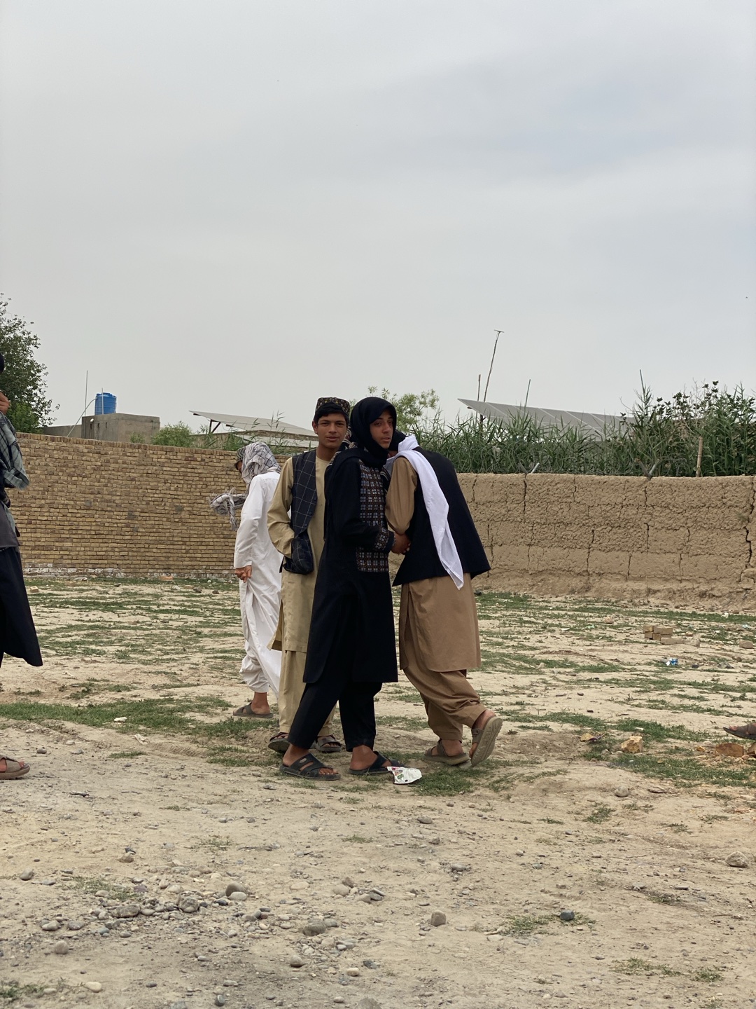 This image depicts a group of approximately five to six men and boys gathered in an outdoor, unpaved area in Kandahar, Afghanistan, on an overcast day. The ground is a mix of dirt, gravel, and sparse…read more