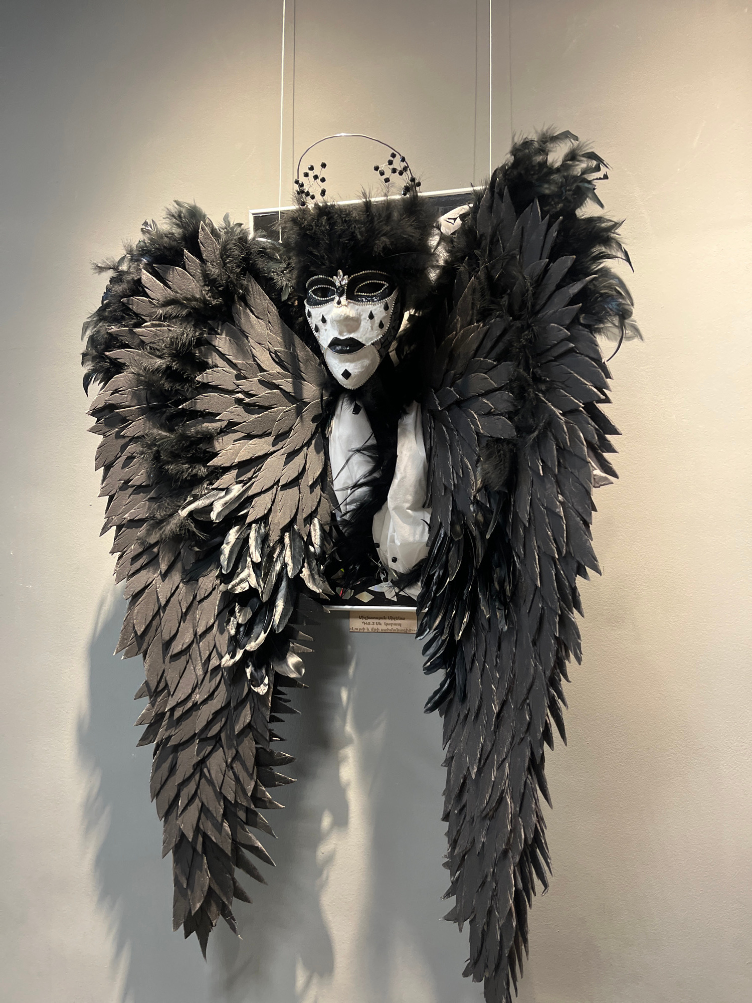 A costume mask and wings are mounted on a wall in Yerevan, Armenia. The mask is white with black detailing and a decorative headpiece. The wings are large and black, made of layered feathers. The mask…read more