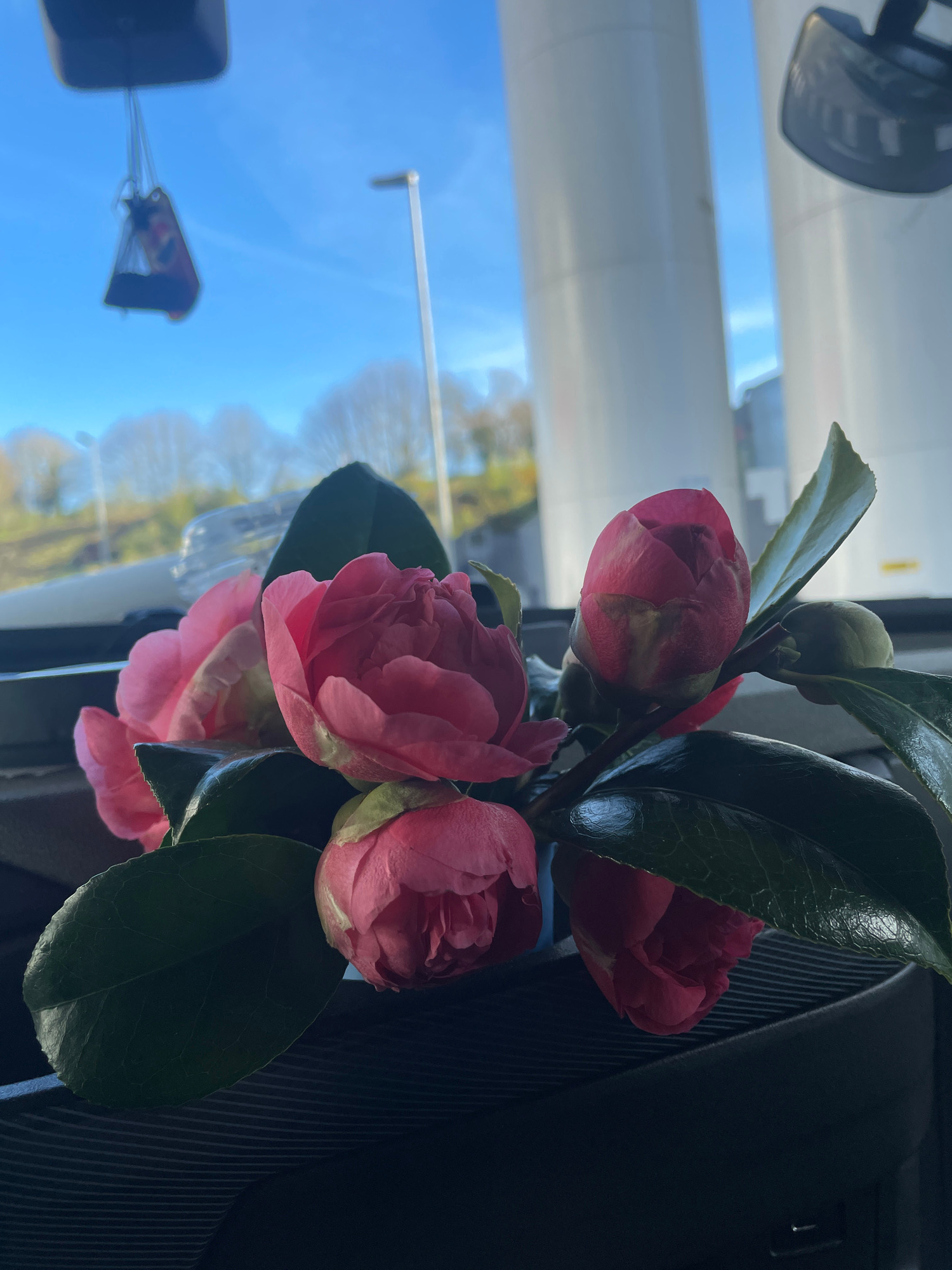 The image shows a bouquet of pink camellias with dark green leaves, positioned indoors against a window. Outside the window, the blue sky and blurred foliage suggest an outdoor setting. The scene inclβ¦read more