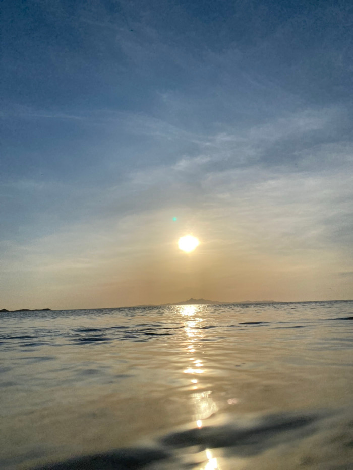 The image depicts a body of water under a sky with the sun shining brightly. The sun is positioned near the horizon, its light reflecting off the water's surface, creating shimmering patterns. Land is…read more