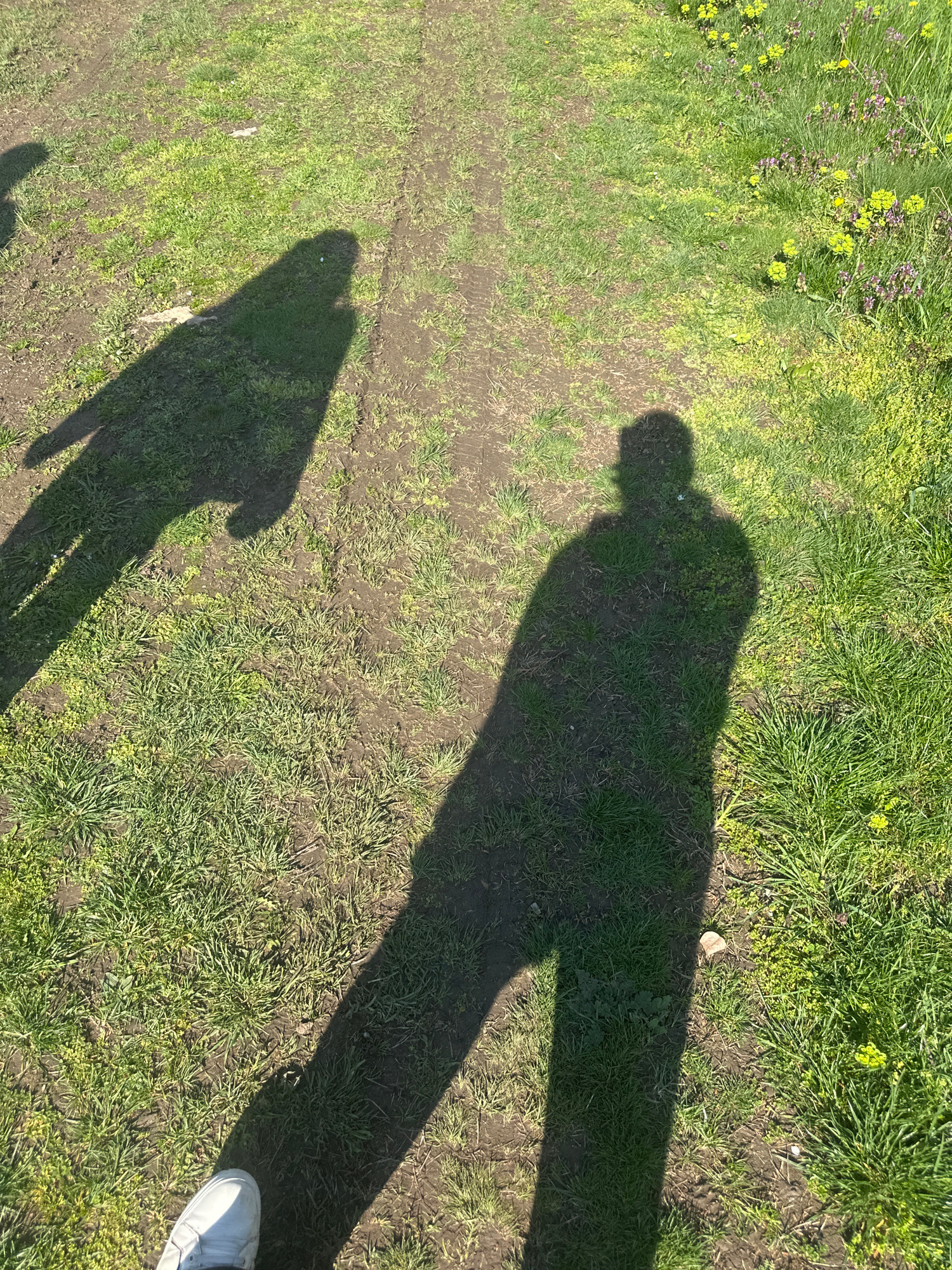The image shows a patch of grassy land, potentially a field or lawn. The grass is primarily green with some yellow flowers interspersed. Two shadows of individuals are visible on the grass, suggesting…read more