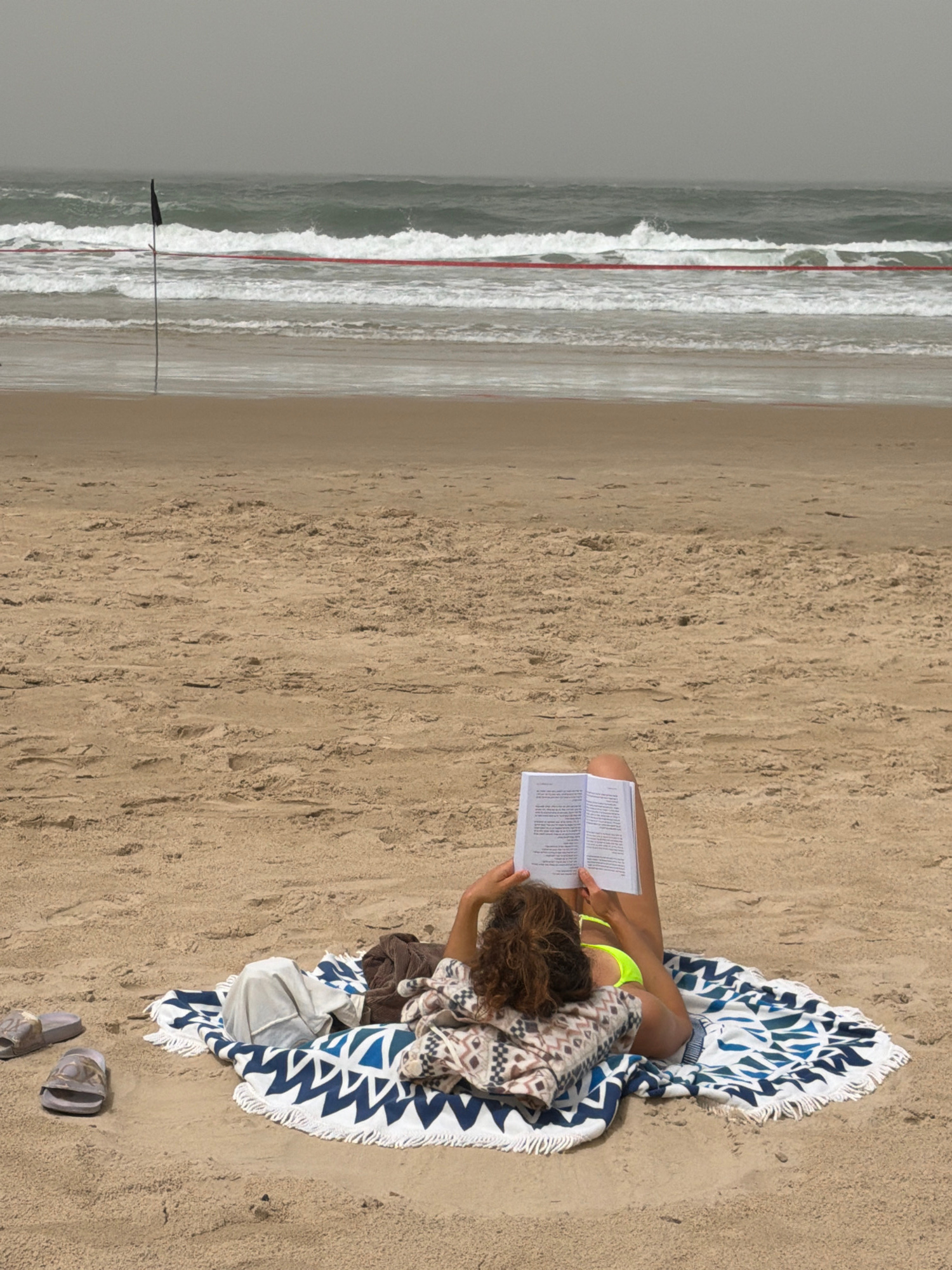 A woman sits on a blue and white patterned blanket on a sandy beach, reading a book. She wears a yellow bikini top and is partially covered by a patterned sweater. Beside her are a bag and a pair of sā¦read more