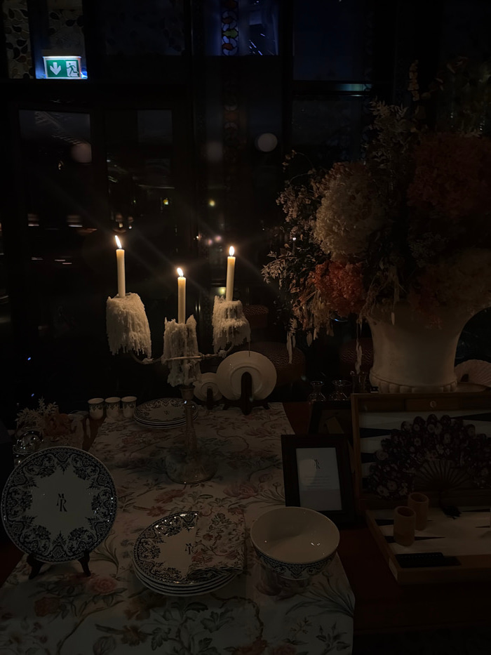 The scene depicts a dimly lit interior of a commercial establishment in Dubai, United Arab Emirates. The foreground features a table covered with a light-colored tablecloth adorned with a floral patte…read more