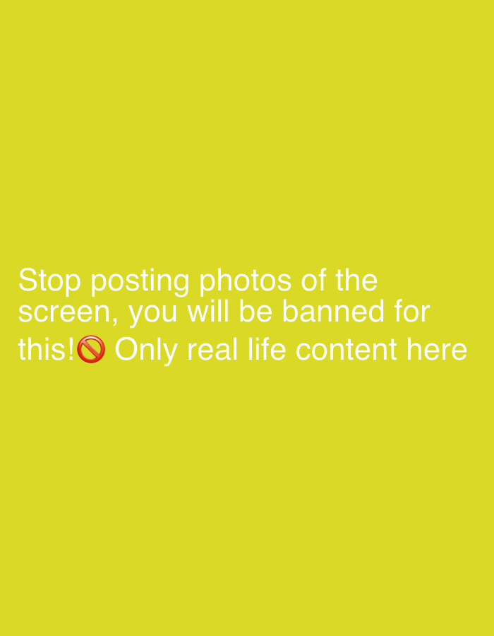 The image is a yellow background with white text that reads "Stop posting photos of the screen, you will be banned for this! Only real life content here." The text also includes a red circle with a li…read more