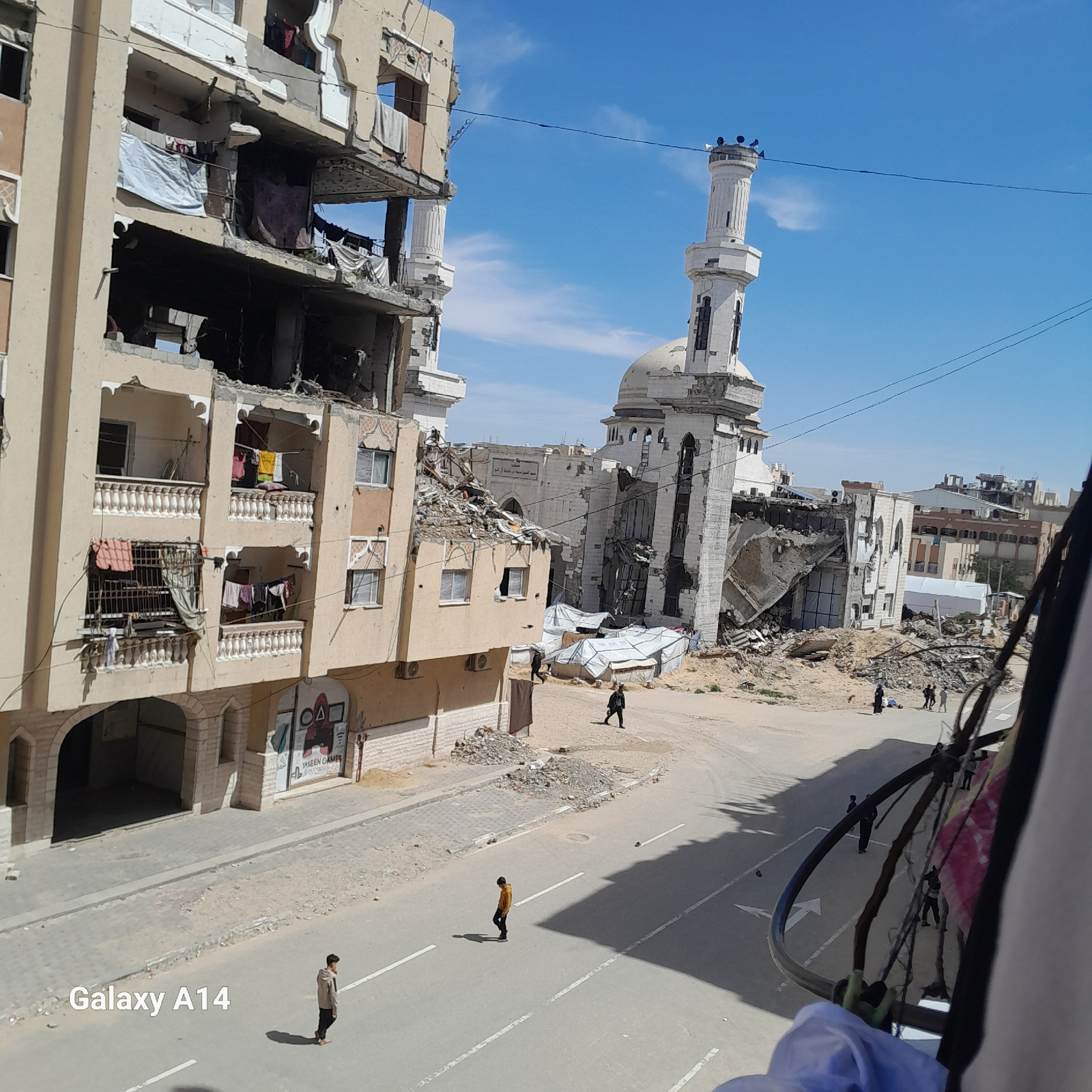 This image depicts a street scene in Khan Yunis, Palestinian Territory, showing extensive structural damage under a clear blue sky with sparse clouds. In the foreground and left, a multi-story buildi…read more