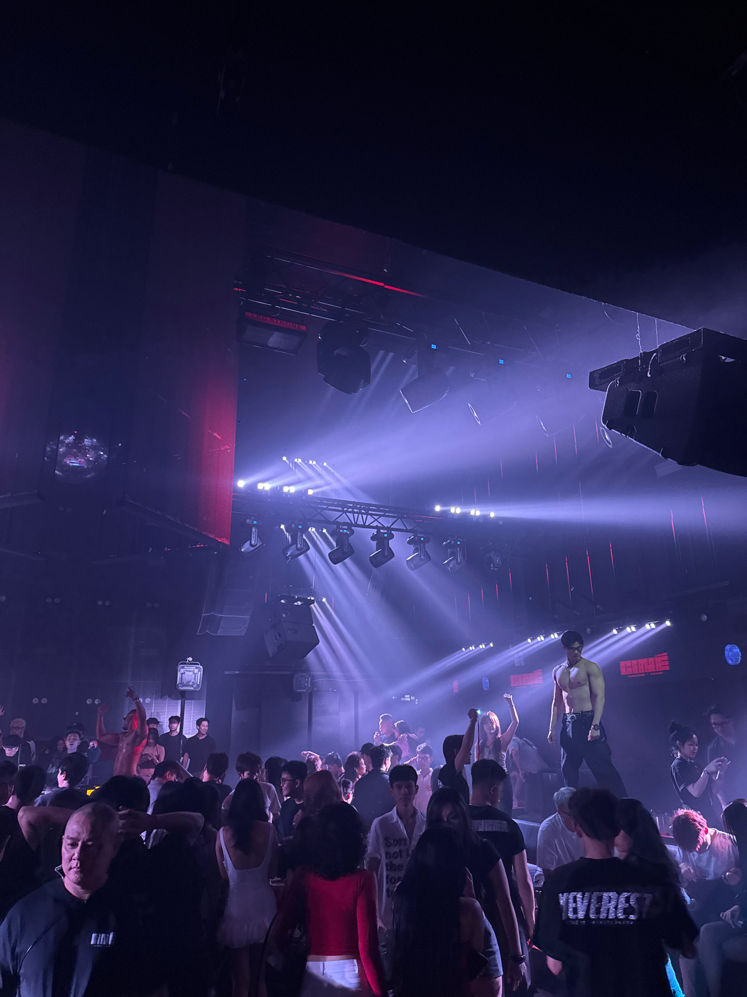 The image captures a scene inside a nightclub, seemingly in the city of Thủ Đức, Vietnam. The lighting is primarily dark with intense beams emanating from stage lights positioned overhead. A crowd of…read more