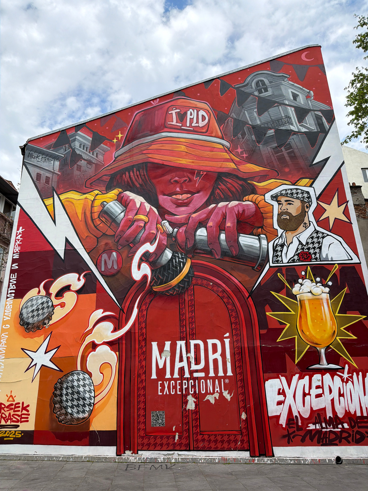 A vibrant, comic book-style mural adorns the side of a building in Plovdiv, Bulgaria, under a cloudy sky. The artwork is rich in reds, yellows, and black, depicting a dynamic urban scene. The central…read more