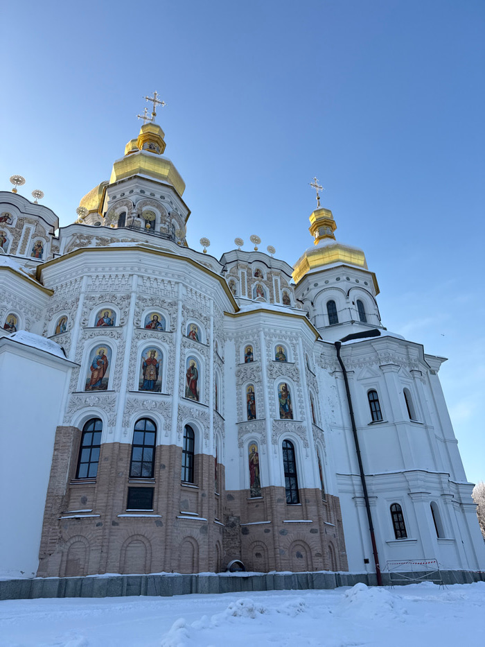 The image displays a detailed exterior view of the Dormition Cathedral (Assumption Cathedral) located within the Kyiv Pechersk Lavra monastery complex in Kyiv, Ukraine, under clear winter conditions.…read more