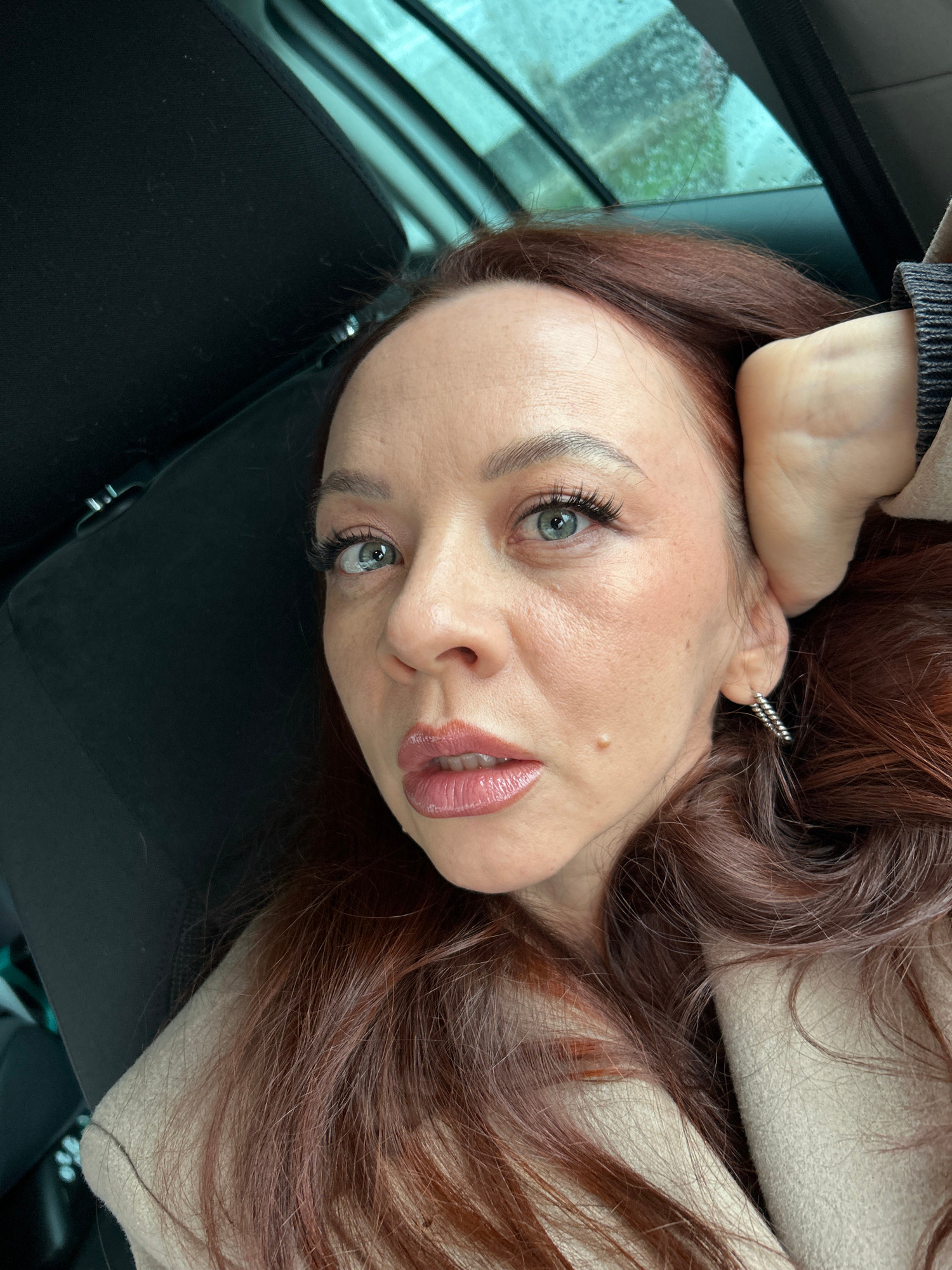 A woman with red-brown hair and green eyes is in the driver's seat of a car. She has a silver hairpin on the right side of her head. She is wearing a beige coat. The window shows rain. The location is…read more