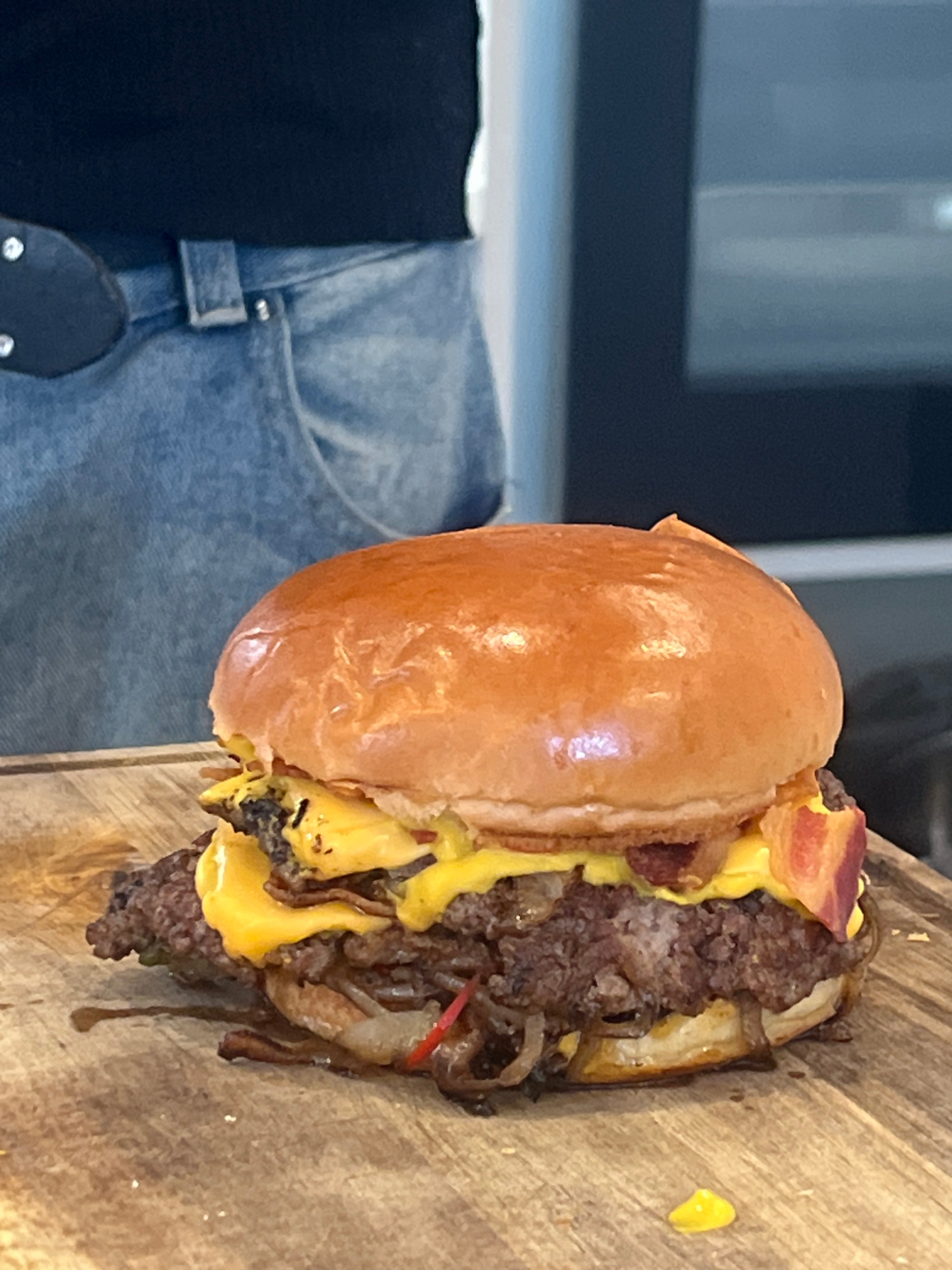 A close-up, indoor, vertically oriented photograph shows a single, large cheeseburger resting on a wooden board. Part of a person is visible to the left of the burger, wearing blue jeans and a black s…read more