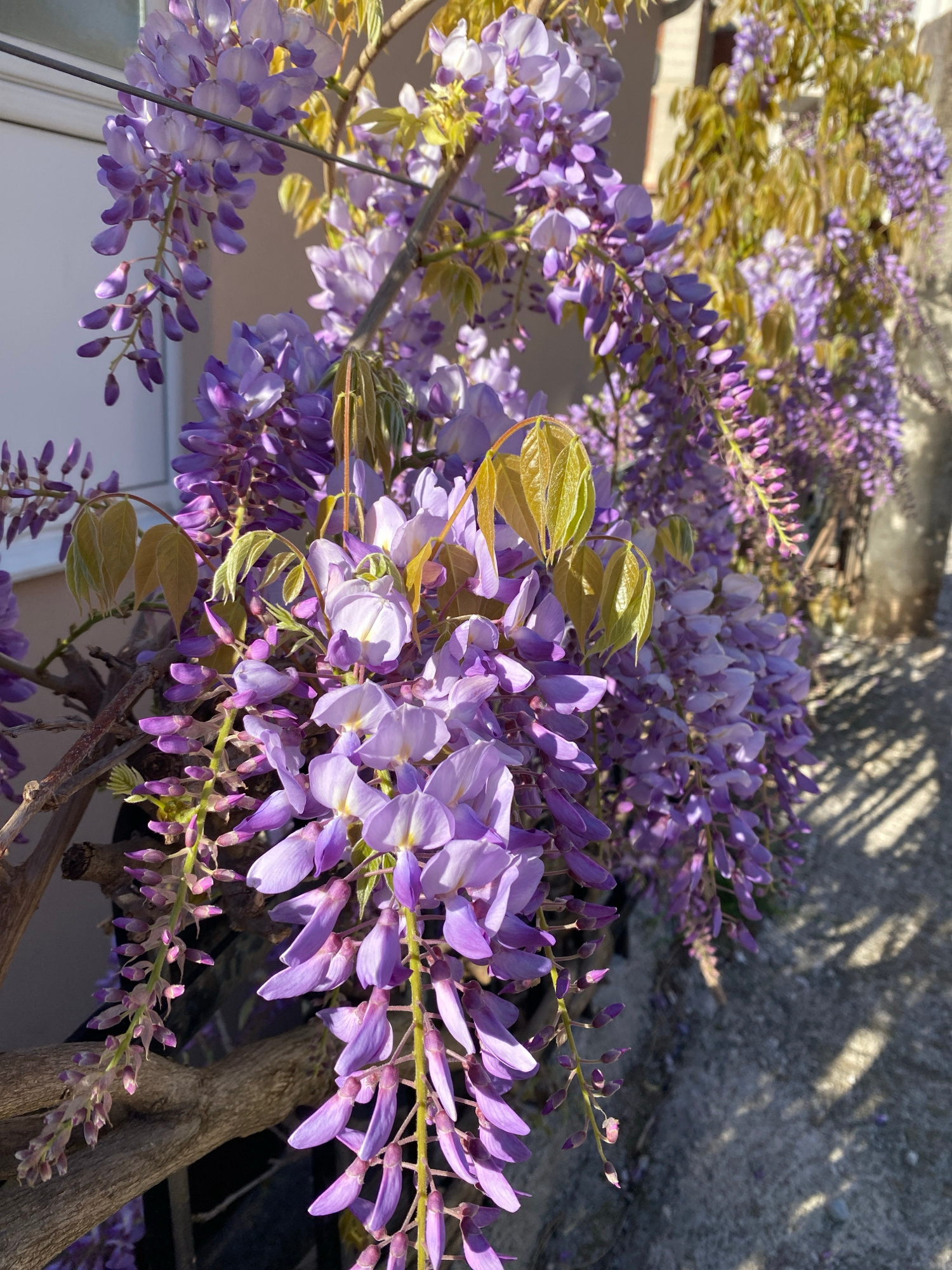 The image depicts blooming wisteria, a climbing, flowering plant known for its fragrant, cascading clusters of purple flowers. The flowers are the primary focus and fill much of the frame. The branche…read more
