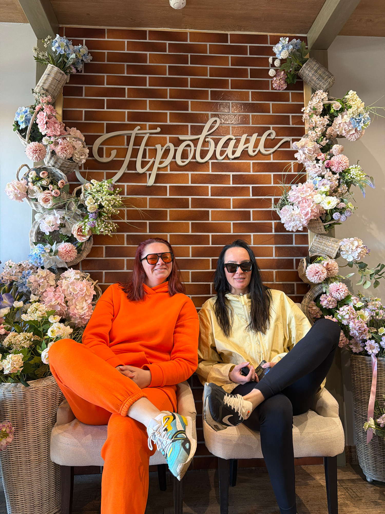 Two women are sitting on wicker chairs in front of a brick wall decorated with baskets of flowers and a white cursive sign. The woman on the left wears an orange tracksuit and orange-tinted sunglassesβ¦read more