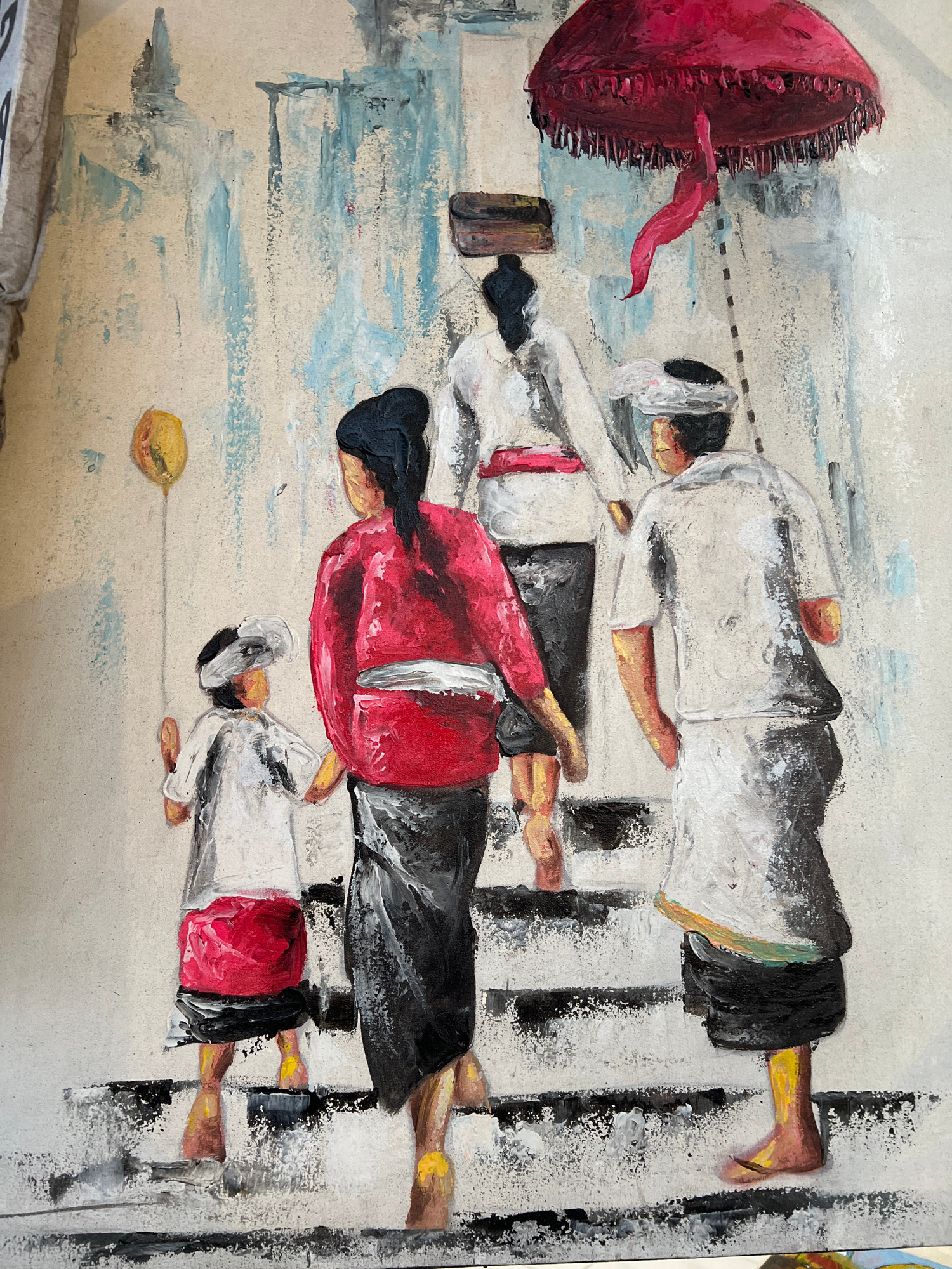 The image is an oil painting depicting a procession of Balinese people in Ubud, Indonesia. The figures are stylized and somewhat abstract, rendered with thick brushstrokes. Three figures are clearly v…read more