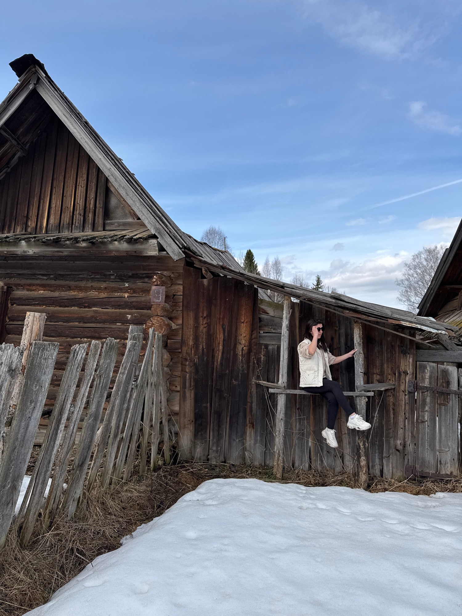 The image depicts a person sitting on a dilapidated wooden structure, possibly an old barn or shed, in Вассята, Russia. The structure is constructed of weathered wood and features a partially collapse…read more