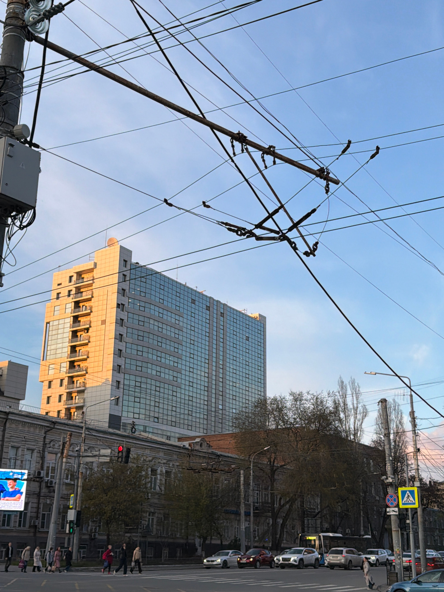 The image shows a street scene in Rostov-on-Don, Russia. A tall, modern, glass-facade building is visible, catching the golden light of either sunrise or sunset. In the foreground are overhead power l…read more