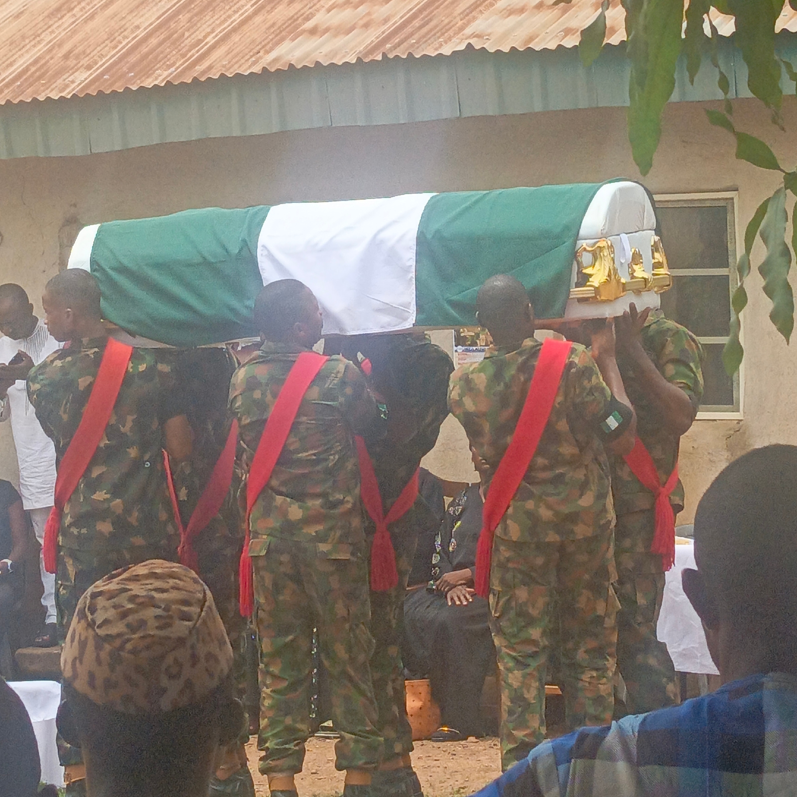 The image captures a funeral procession in Akwanga, Nigeria. A coffin draped in the Nigerian flag is carried by pallbearers dressed in military camouflage uniforms with red sashes. A small Nigerian fl…read more