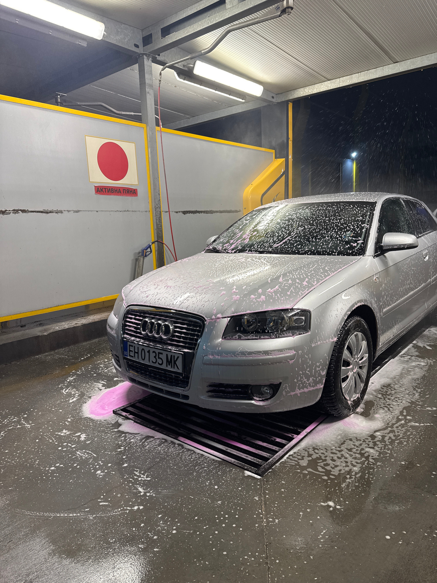A silver car is being washed at a self-service car wash. The car is covered in pink foam. The license plate reads "EH 0135 MK". The car wash stall is illuminated with bright fluorescent lights. A sign…read more