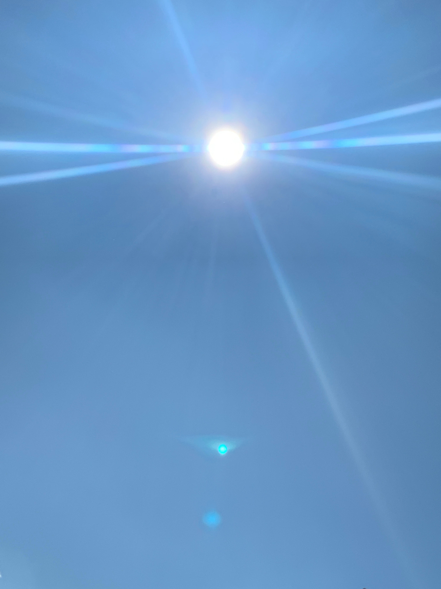 The image shows a bright sun in a light blue sky. The sun's rays are visible, creating a strong glare and lens flare. The location is unknown and cannot be determined from the image. No people, object…read more