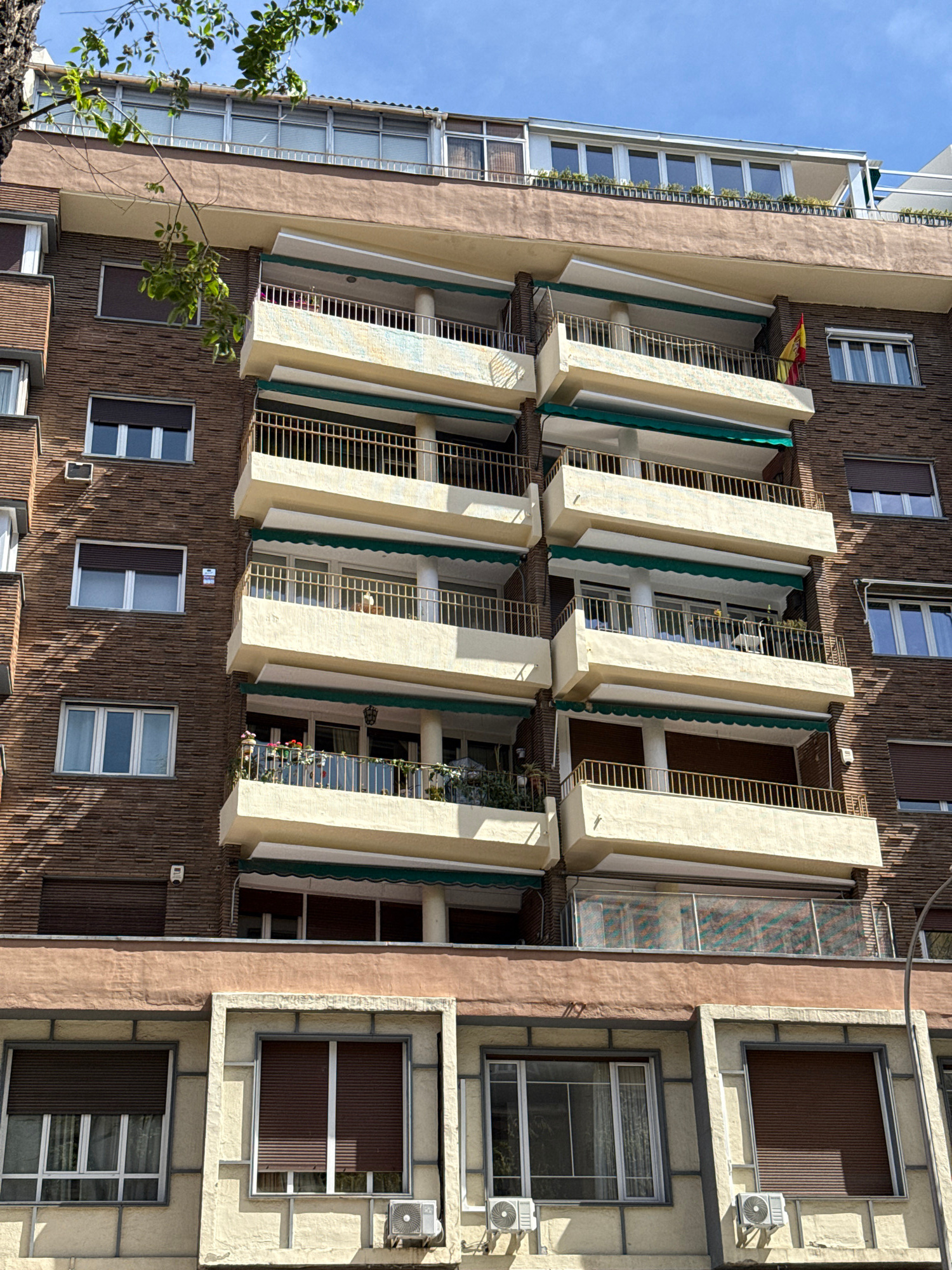 The image shows the exterior of a tall apartment building, photographed from a low angle. The building has a mixed facade, with sections of dark brown, vertical ridged material contrasting with light…read more