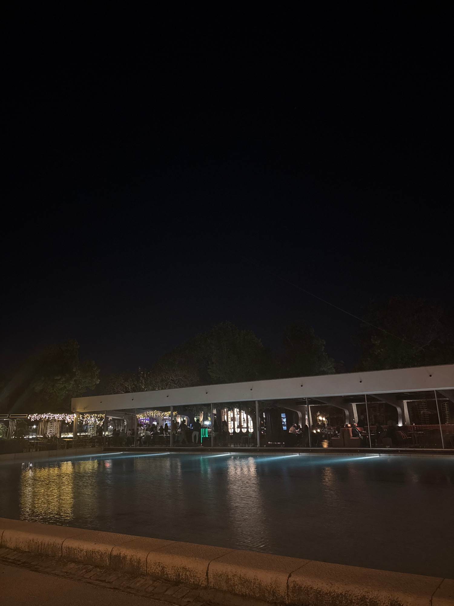 This nighttime photograph captures the SUD Lisboa complex, located on Avenida Brasília in Lisbon, Portugal. The scene prominently features a modern, elongated building with a flat white roof and a gla…read more