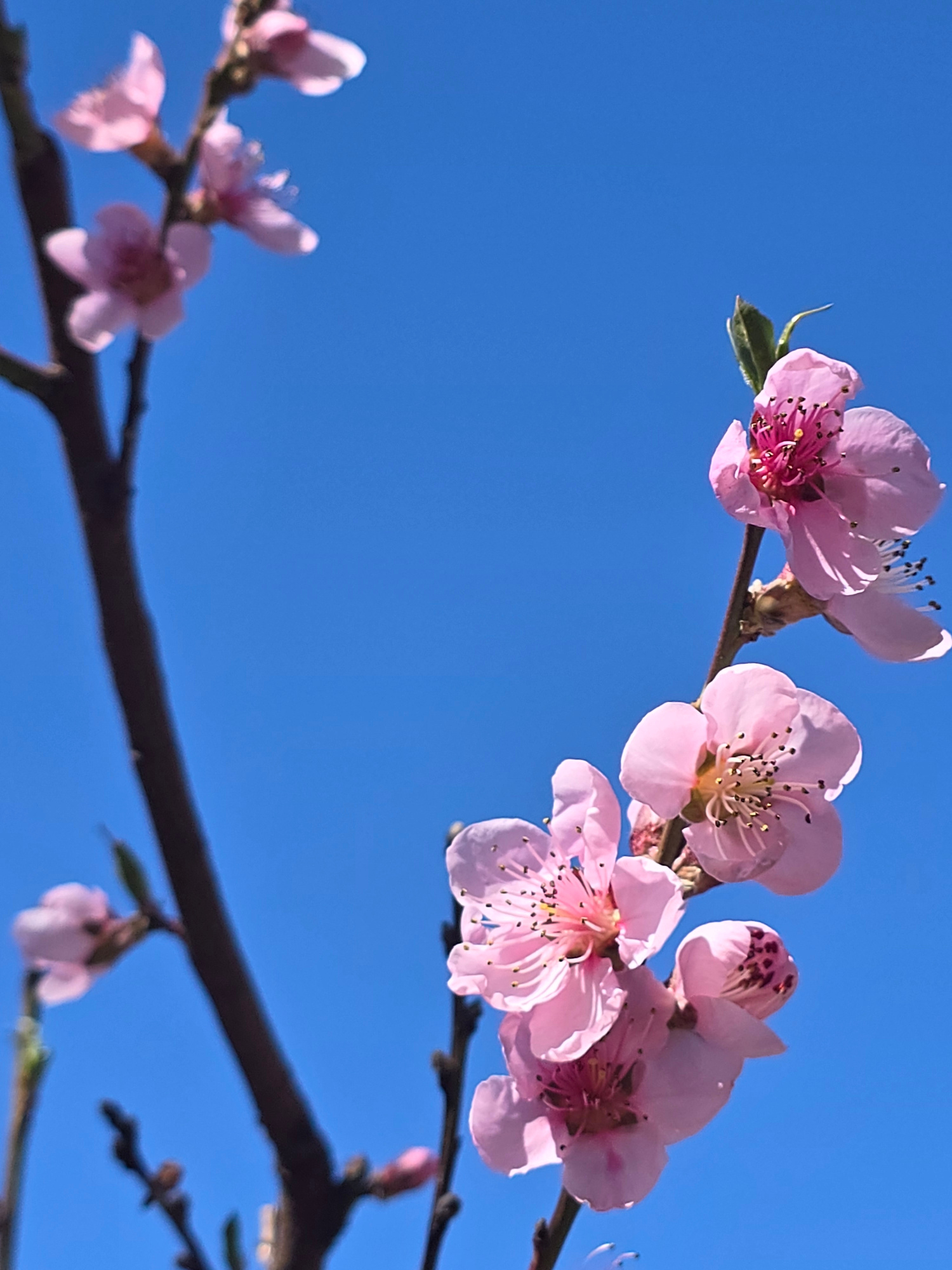 Pink blossoms bloom on a dark branch against a clear blue sky. The branch extends from the lower left corner to the upper right, bearing several clusters of pink flowers with prominent pistils. The lo…read more
