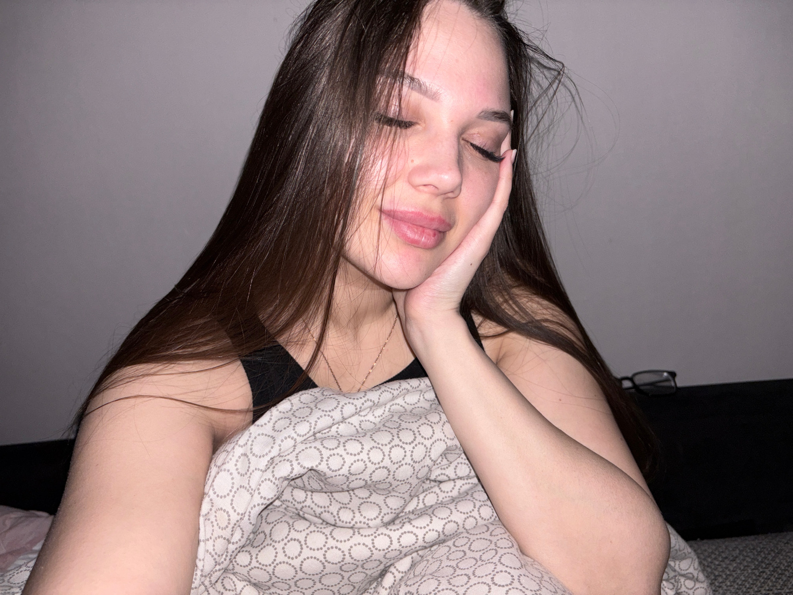 The image displays a young woman in an inverted orientation, appearing upside down, seemingly resting indoors. She has long, dark brown hair cascading around her head. Her eyes are closed or mostly cl…read more