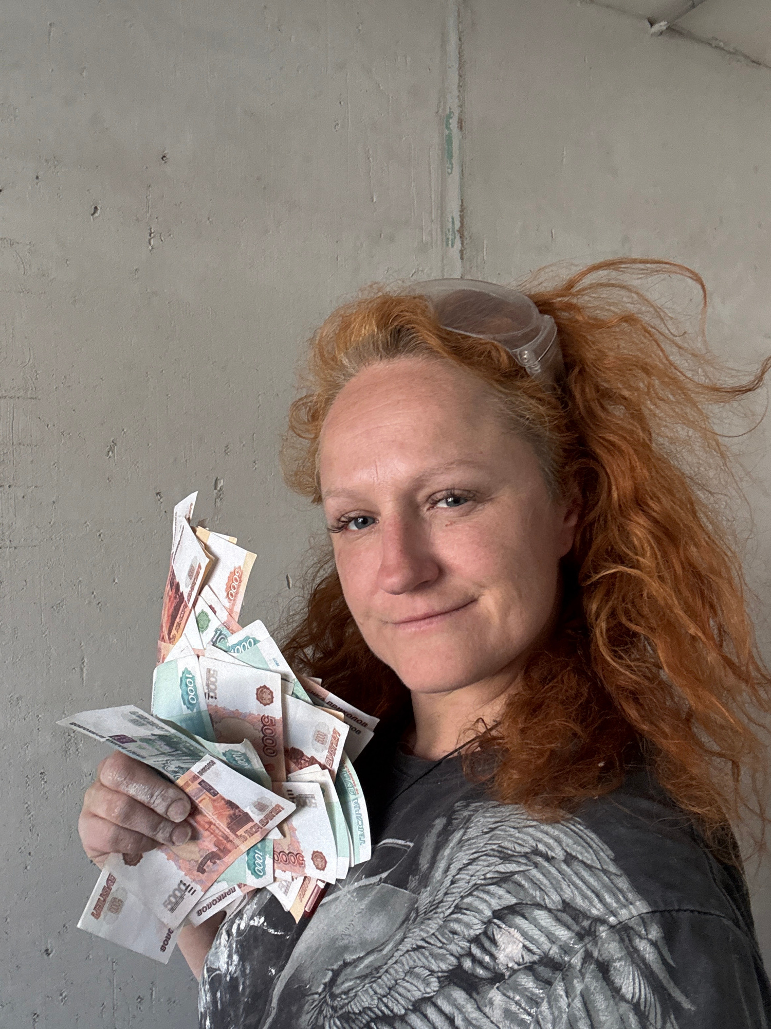 The image depicts a person with red hair, wearing safety glasses and a dark t-shirt with a grey wing design, holding a large amount of Russian rubles, specifically 5000 and 1000 denominations. The per…read more