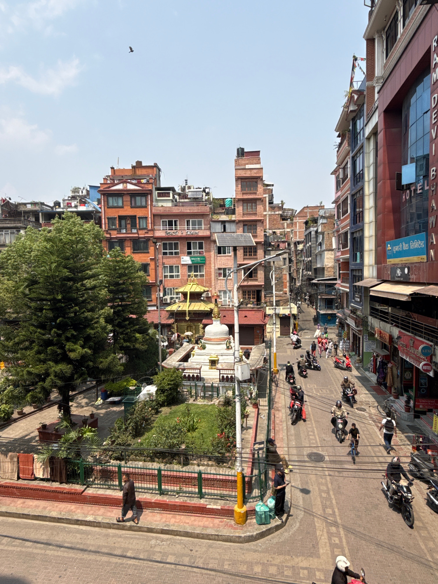 This image depicts a street scene in Kathmandu Metropolitan City, Nepal. The photograph is taken from an elevated position looking down on a street bustling with motorcycle traffic and pedestrians.…read more