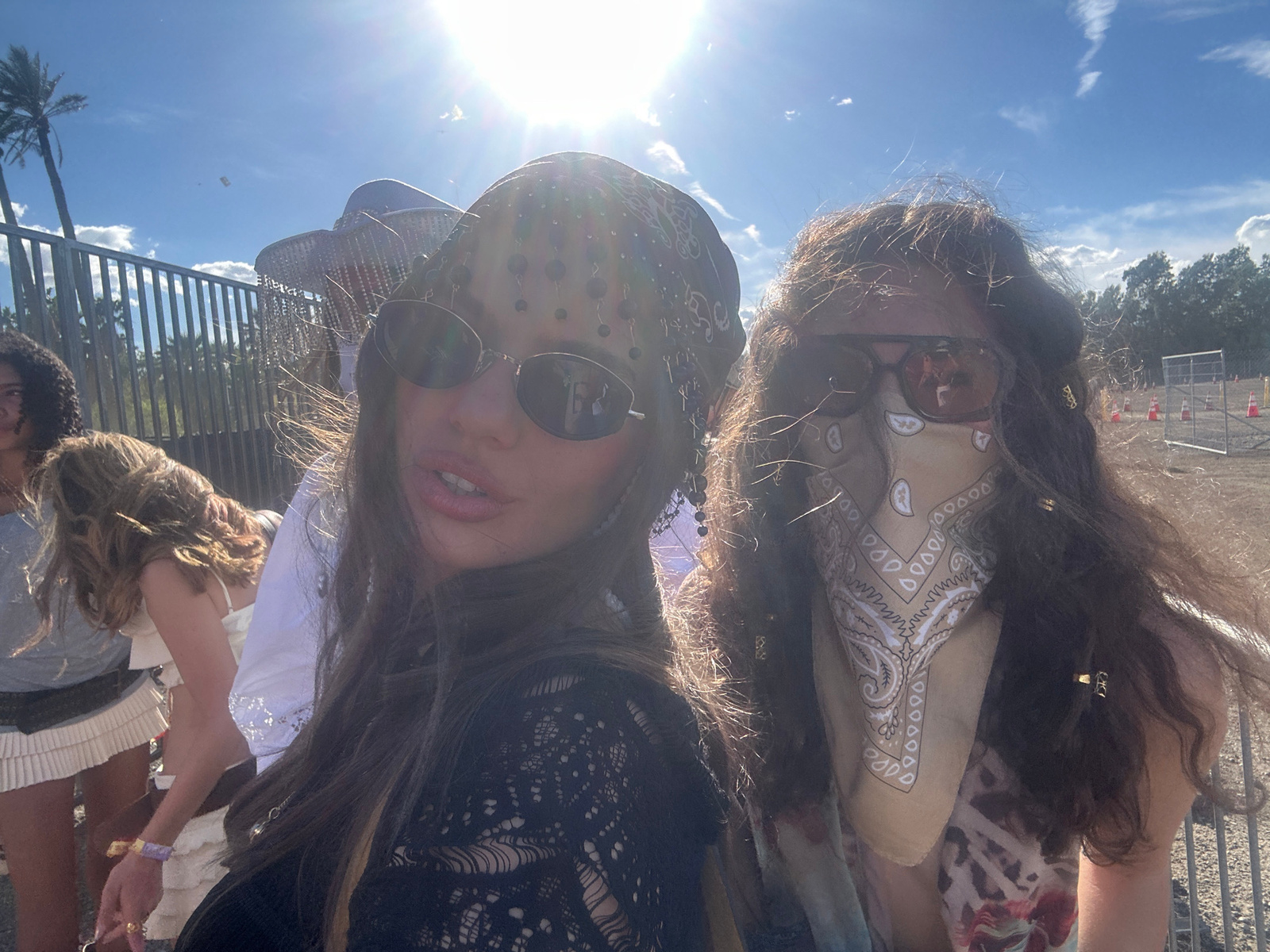 Two young women pose for a selfie on a sunny day at the Coachella Valley Music and Arts Festival in Indio, California, United States of America. The woman on the left wears sunglasses and a bandana. T…read more