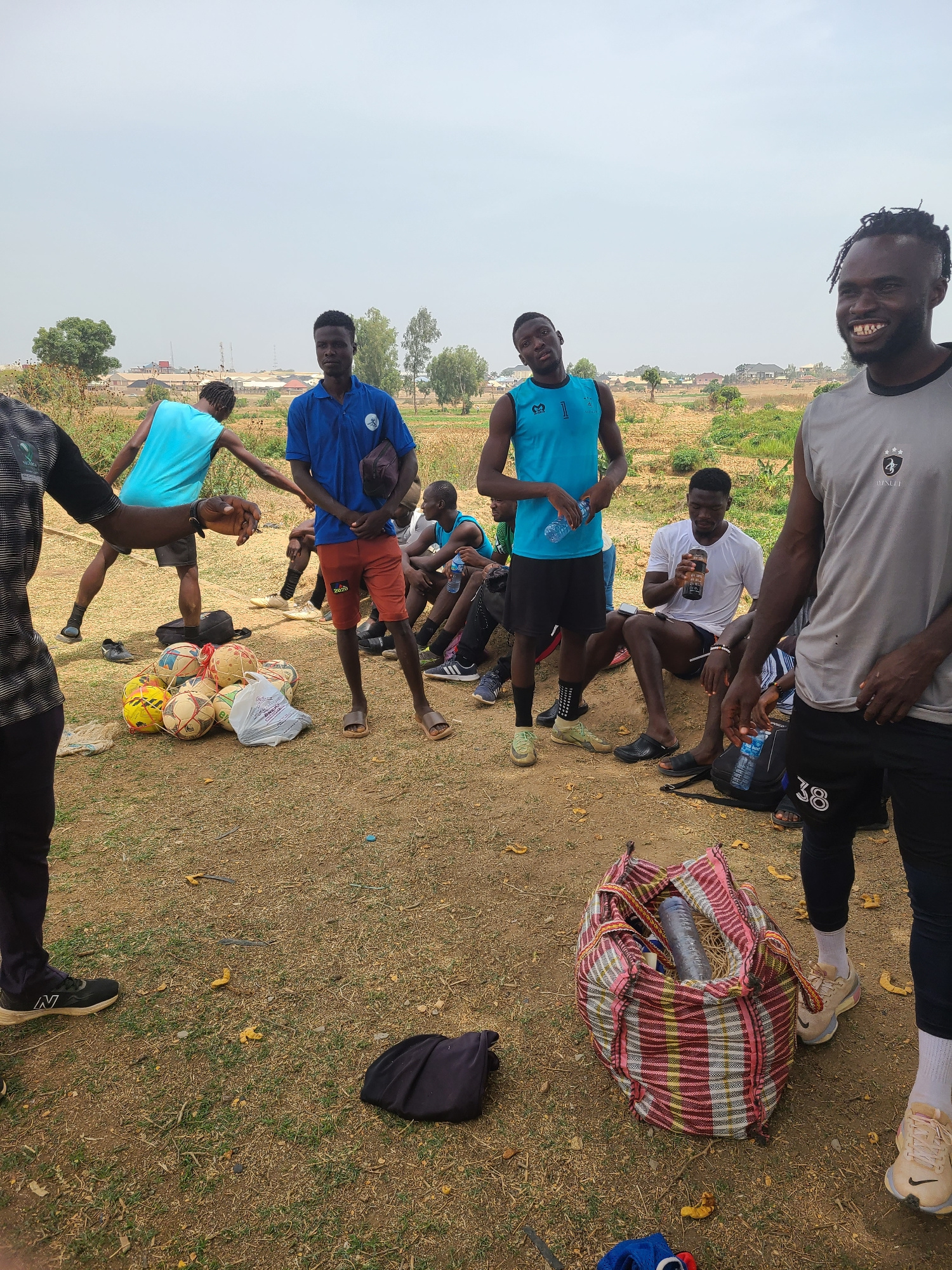 A group of young men are gathered outdoors in Barikin Jirga Summa, Nigeria. They appear to be resting, possibly after a soccer game. Several soccer balls are piled together. Some of the men are holdin…read more