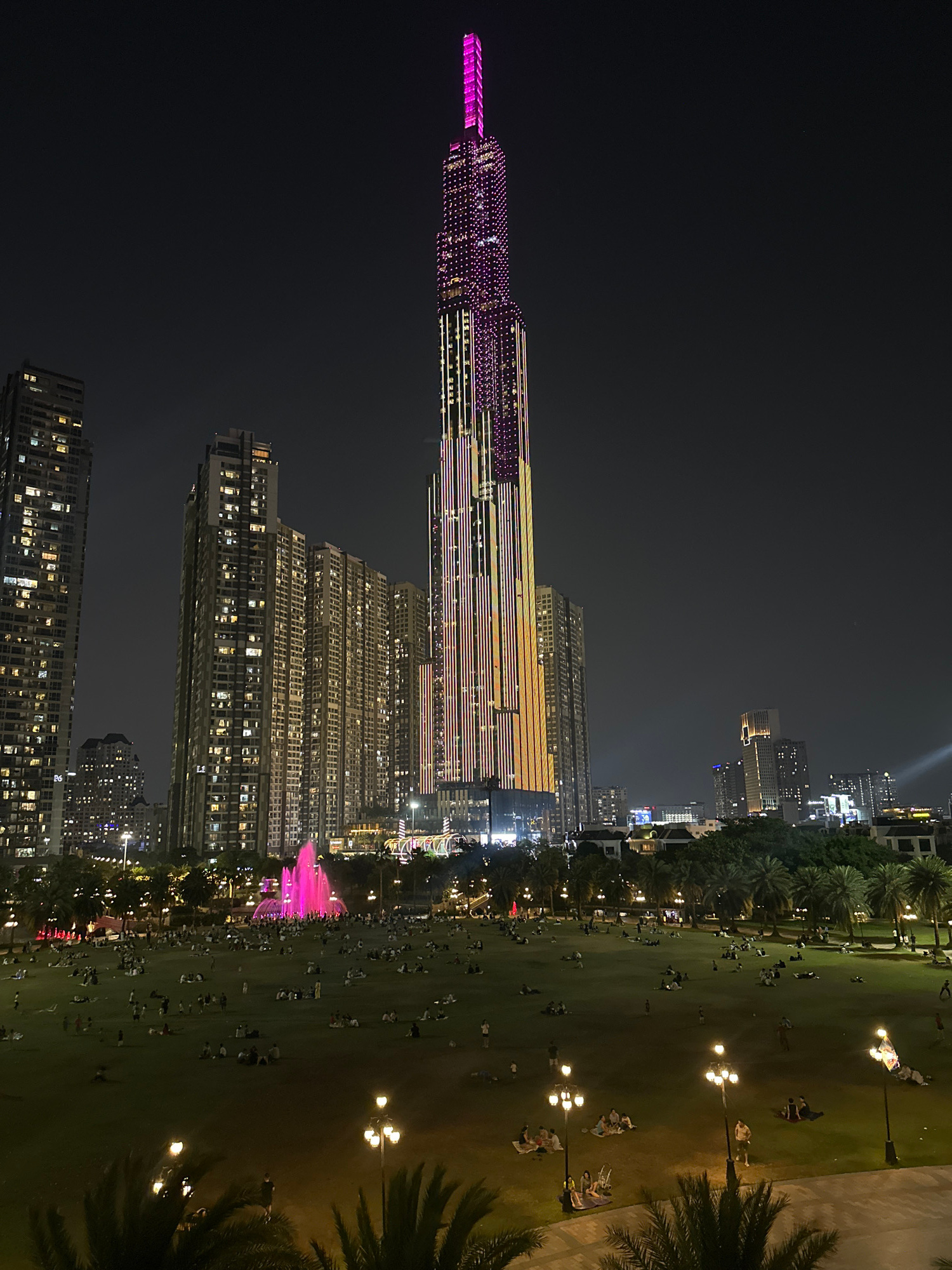 Here is a description of the image: The image shows a night scene in Thủ Đức, Vietnam. A tall, illuminated skyscraper dominates the view, adorned with pink and orange lights. In the foreground, a lar…read more