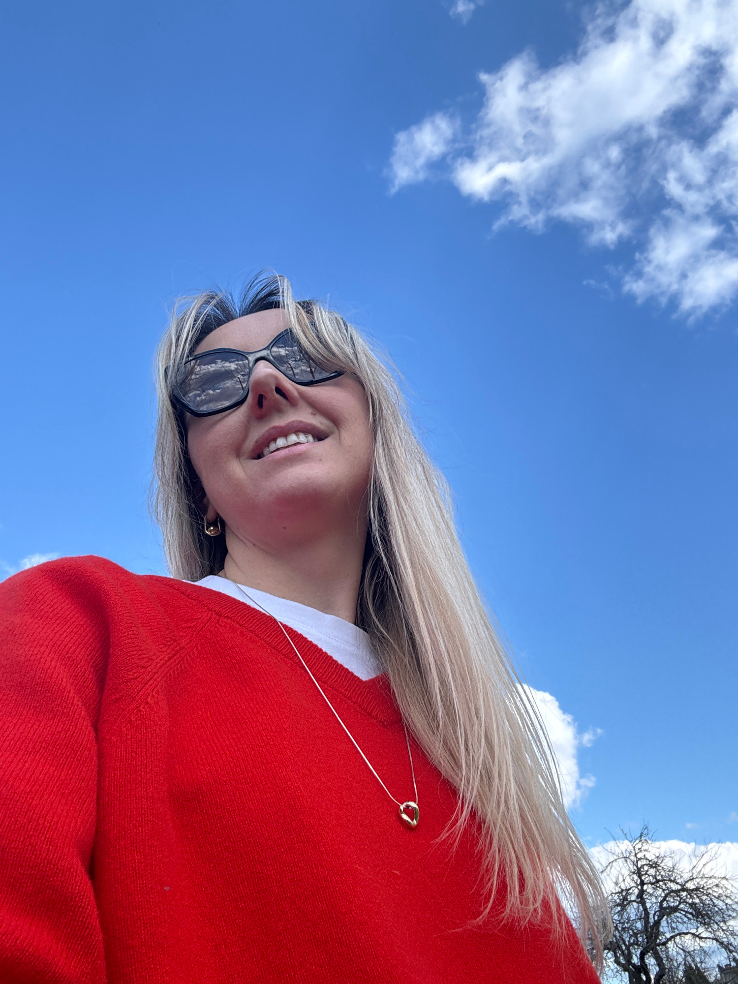 A woman with long blonde hair and sunglasses is angled towards the camera against a backdrop of blue sky with scattered white clouds. She is wearing a red sweater over a white shirt and a delicate gol…read more
