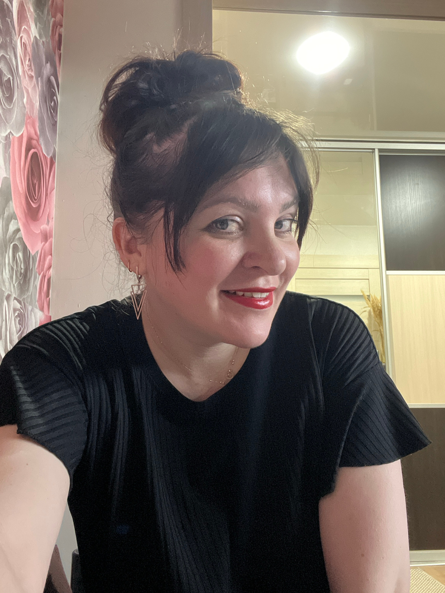 A single adult female is depicted in a close-up, head-and-shoulders portrait shot within an indoor residential setting in Noviy, Russia. The subject has dark hair styled in a high bun with loose stran…read more