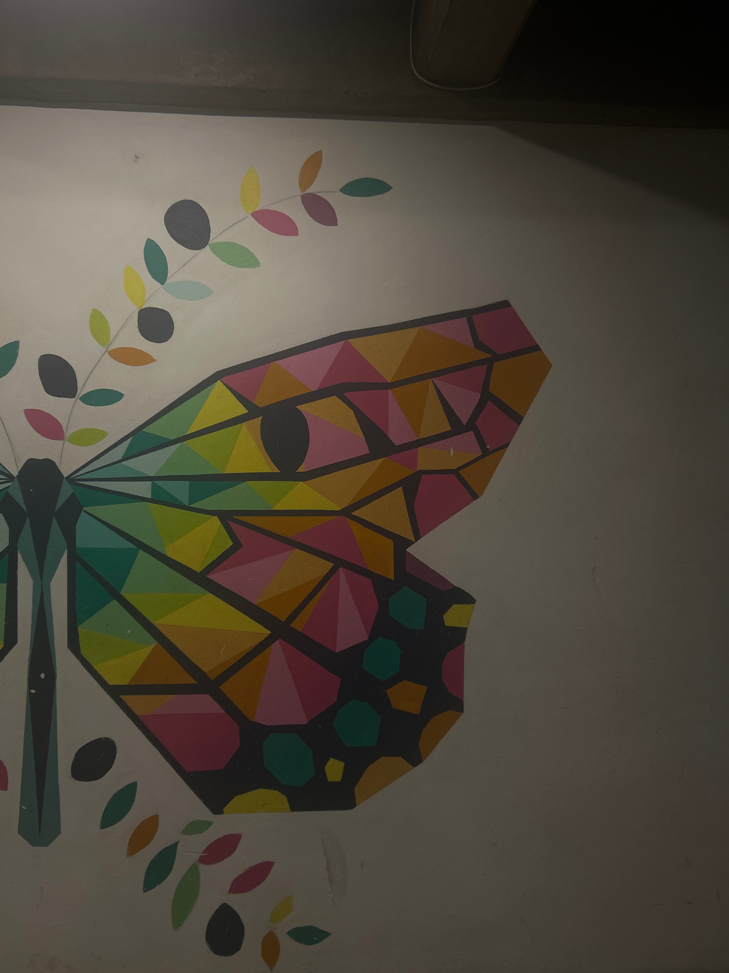 The image shows a mural painted on a white wall. The mural depicts a stylized butterfly with geometric shapes and a vibrant color palette, including pink, yellow, green, and teal. The butterfly's wing…read more