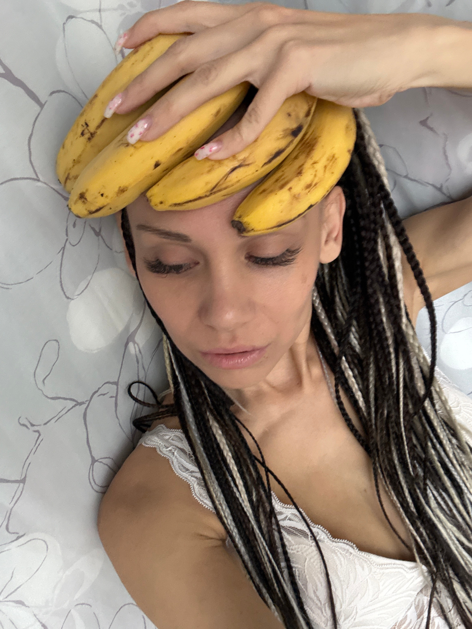 A woman lies on a bed with a light gray, patterned sheet. She has brown and white braids and is wearing a white lace top. Her eyes are closed, and she is holding three bananas on her forehead with herβ¦read more
