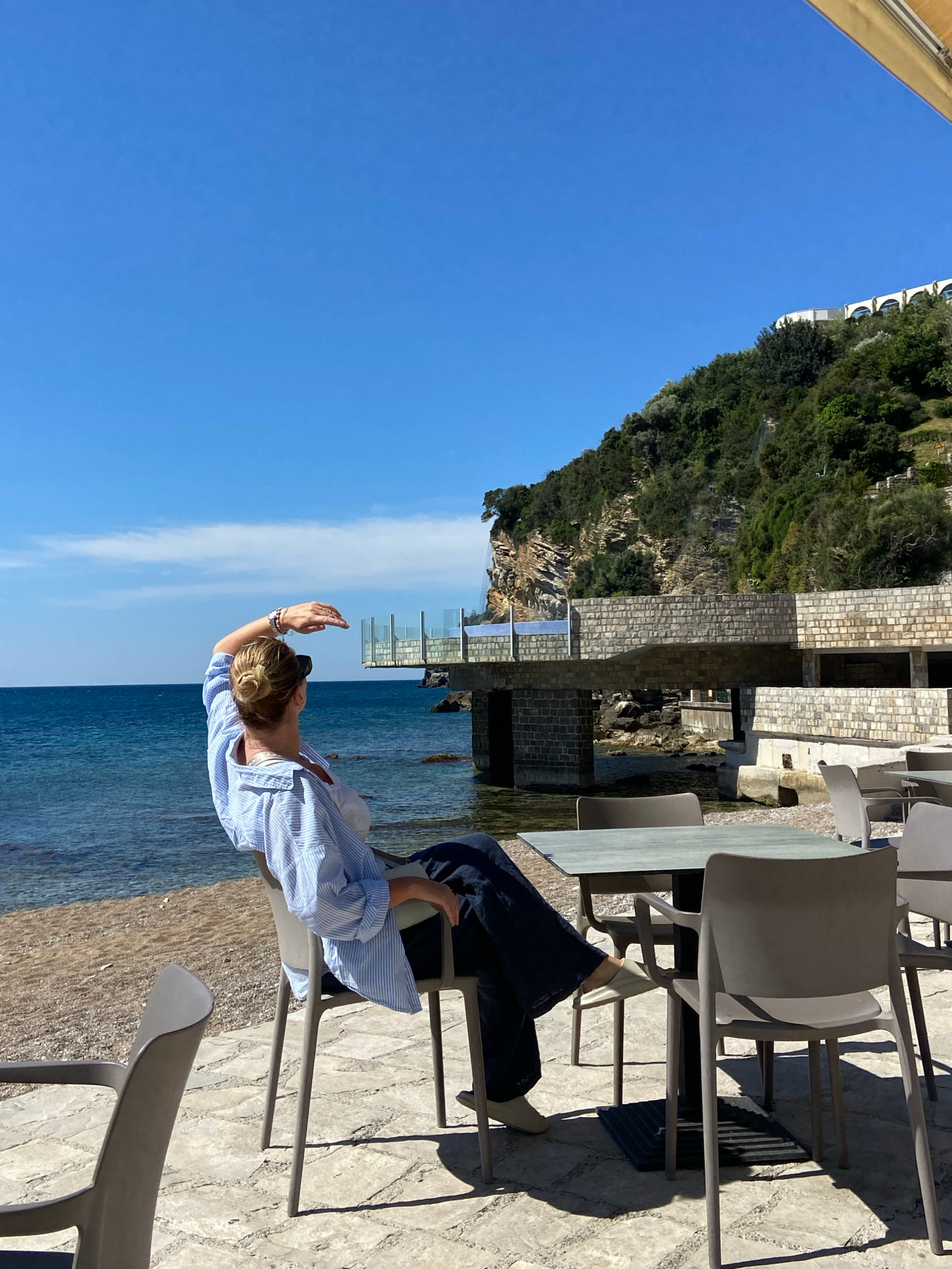 A woman in a blue and white striped shirt and dark pants is reclining in a gray chair at an outdoor cafe. The cafe is situated on a stone patio overlooking the Adriatic Sea in Budva, Montenegro. In th…read more