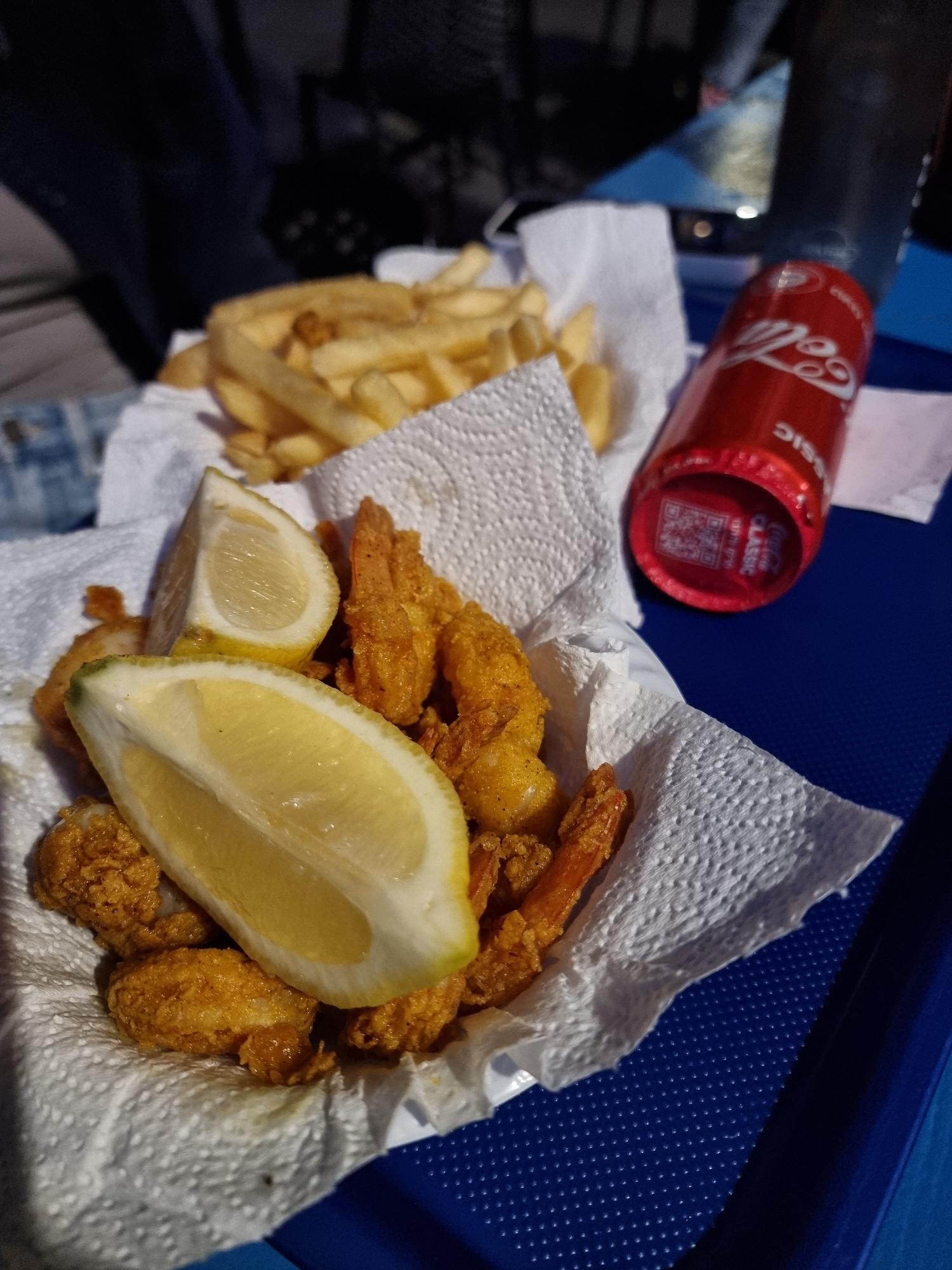 The image shows a meal of fried shrimp, french fries, and lemon wedges served on a white paper napkin on a blue tray. A can of Coca-Cola Classic is also present on the tray. The location and people ar…read more