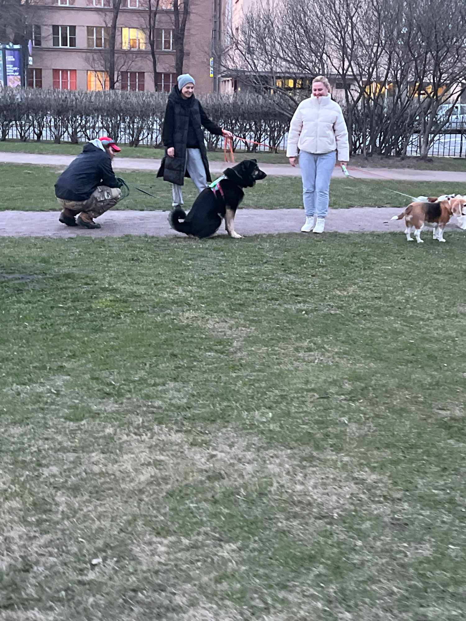 The image depicts a scene in a park in Saint Petersburg, Russia. Three people are present with dogs. One person, wearing a red hat and dark clothing, is crouched down near the bottom of the image. Anoβ¦read more