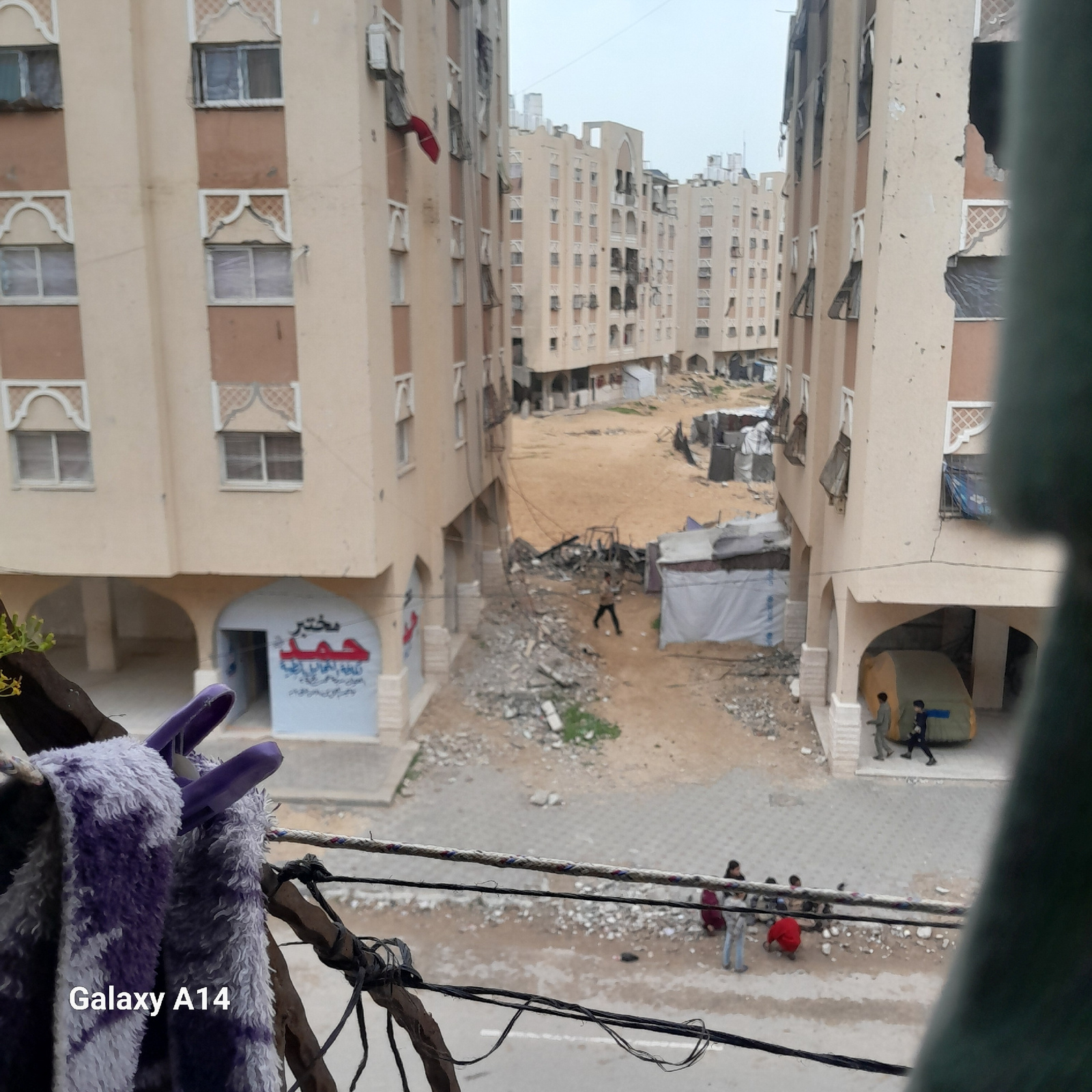The image shows an aerial view of a scene in Khan Yunis, Palestinian Territory, likely taken from an elevated position within a building. The foreground features a portion of a clothesline with two pu…read more