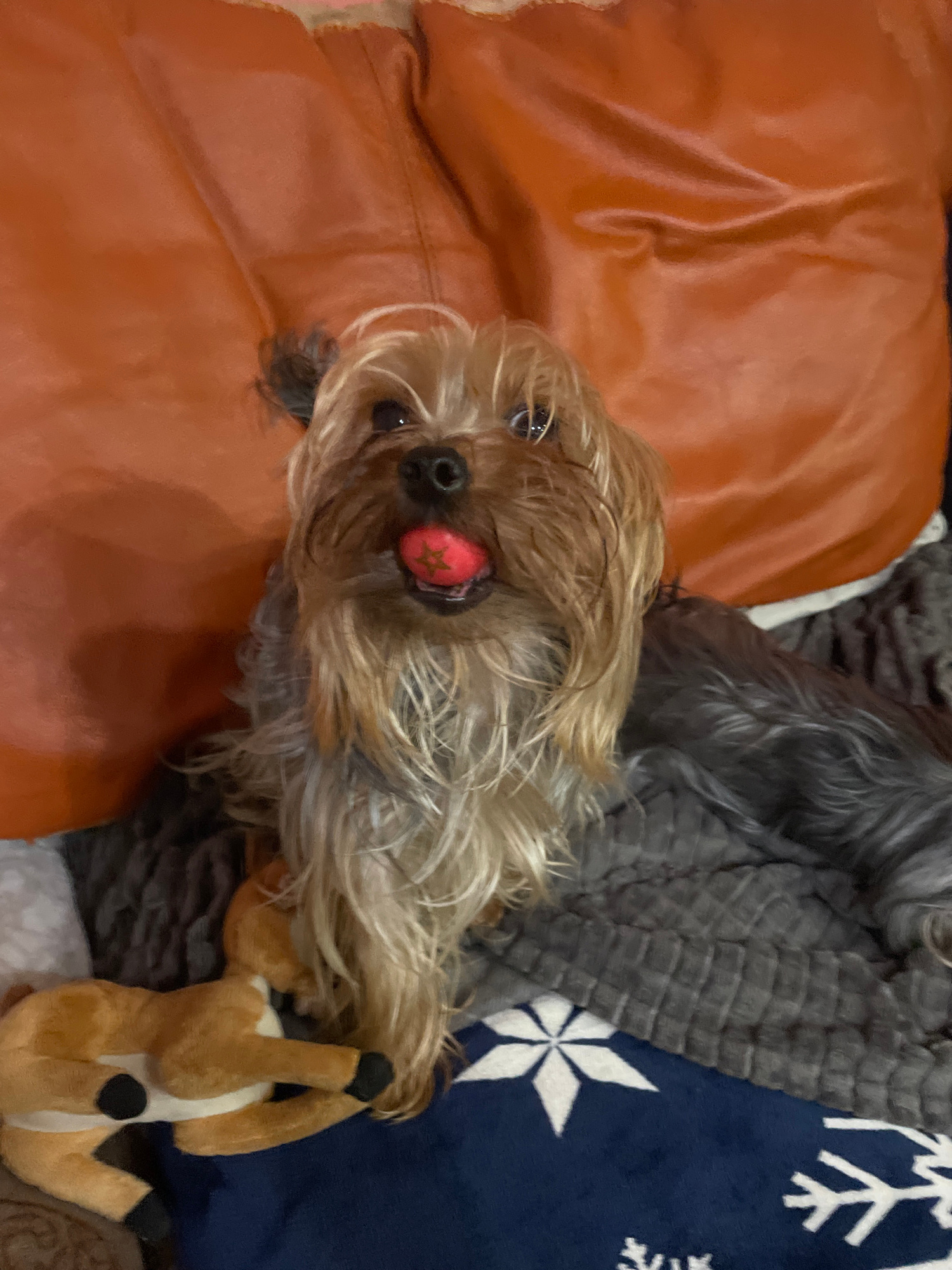 A close-up, high-angle shot shows a small, long-haired dog with a red and gold star hair clip lying upside down. The dog is positioned between a shiny, orange leather surface on the left, a gray textu…read more
