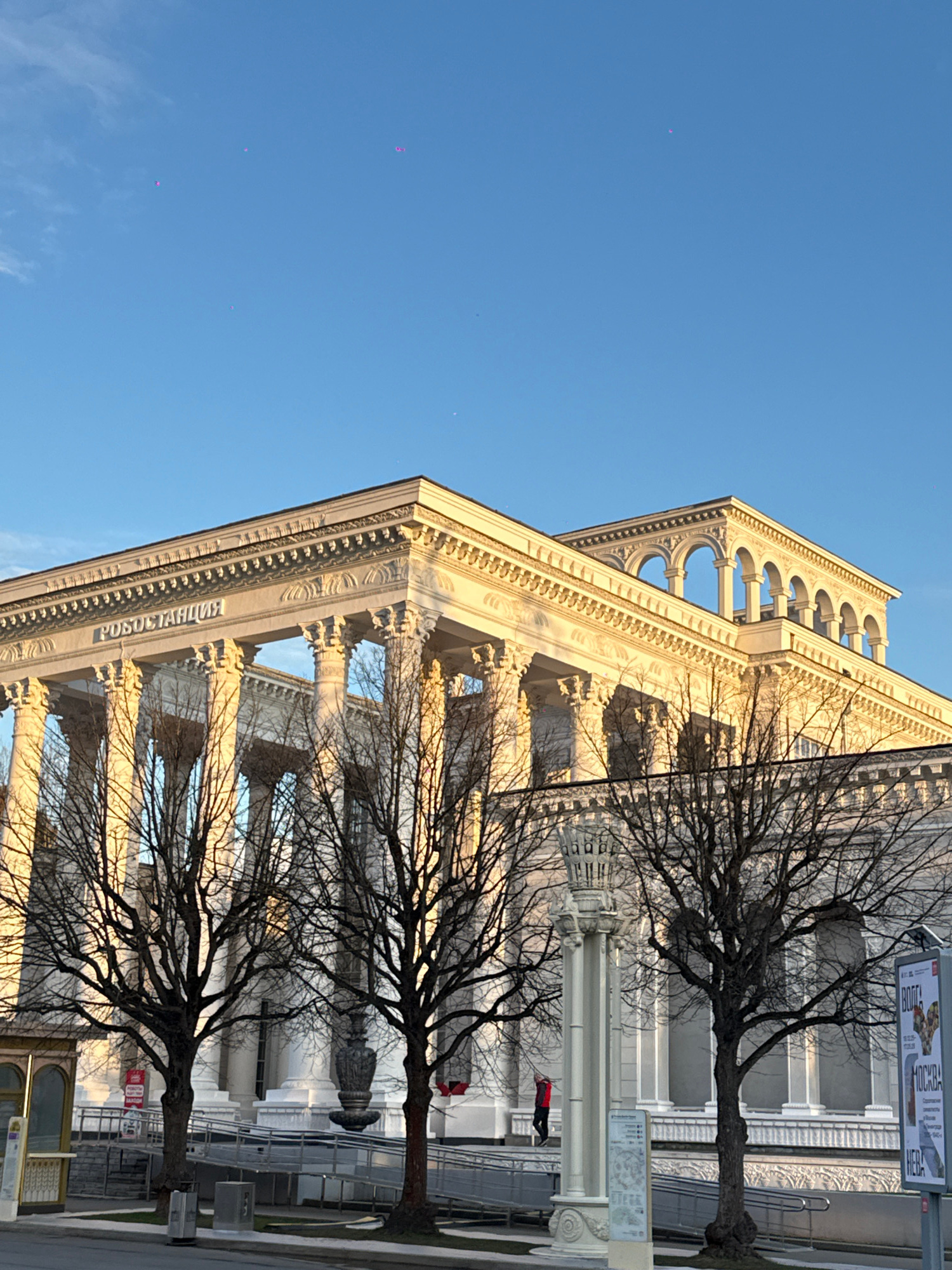 The image shows a building with neoclassical architecture, featuring columns and a balustrade with arches. The building has the word "РОБОСТАНЦИЯ" written on it in Cyrillic. Two bare trees are in the…read more